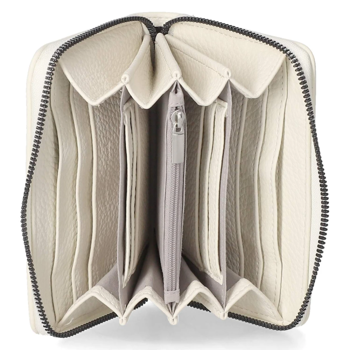 Zeitlose Eleganz im Taschenformat: Diese weiße Geldbörse für Damen überzeugt als klassisches Modell mit klarer Linienführung und einem dezent schimmernden, silberfarbenen Markenlogo. Ein rundumlaufender Reißverschluss schützt den Inhalt, innen sorgt das durchdachte Layout für Übersichtlichkeit: ein Reißverschluss-Münzfach, vier Geldscheinfächer, sechs Visitenkartenfächer und sechs zusätzliche Steckfächer nehmen Alltägliches strukturiert auf. Die griffige Haptik und hochwertige Verarbeitung machen sie zum langlebigen Begleiter für Büro, City und Reise. Kontrastierende Metallakzente unterstreichen die moderne Note, ohne den puristischen Charakter zu stören. Modetipp: Besonders stimmig zu monochromen Looks in Weiß, Grau oder Schwarz und mit silberfarbenem Schmuck oder Hardware an Tasche und Gürtel kombiniert.