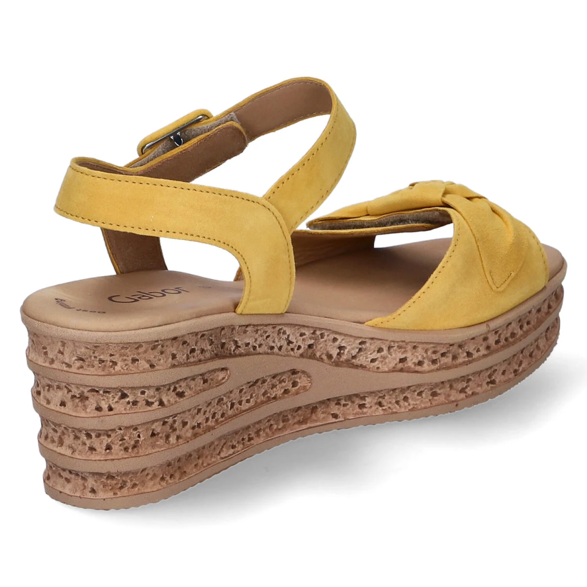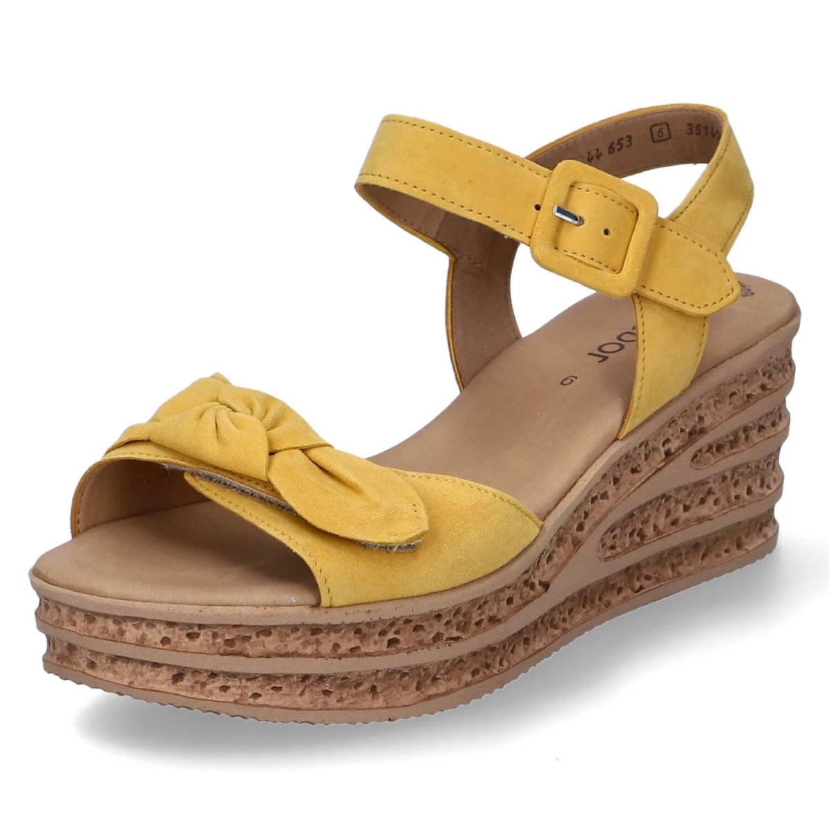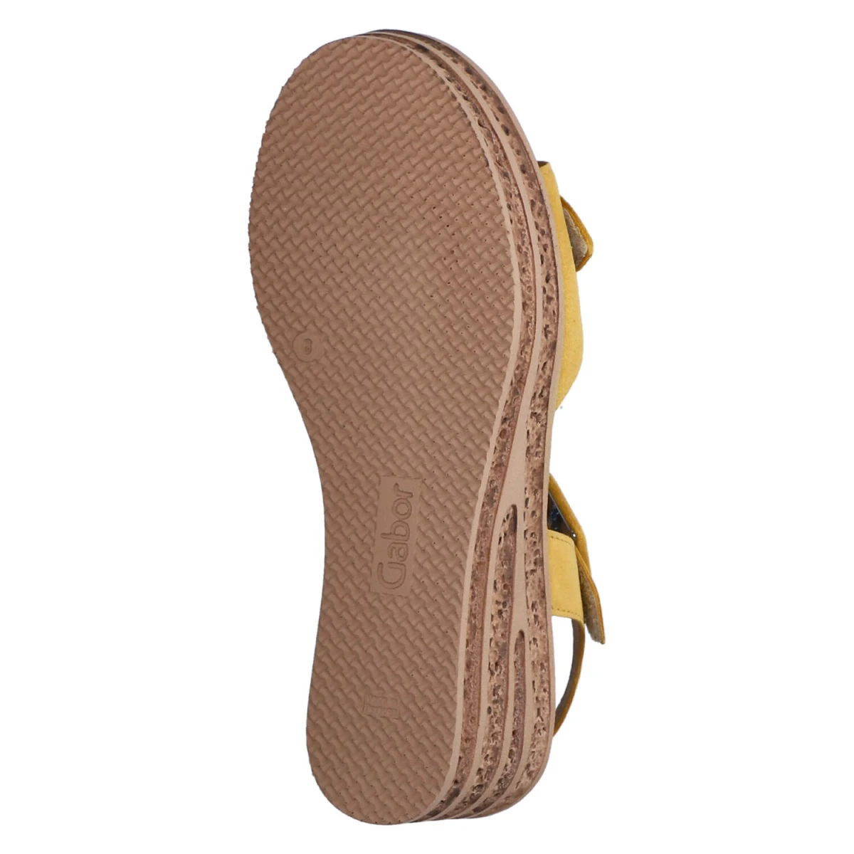 Sonnige Eleganz für warme Tage: Die Gabor Keilsandaletten vereinen langlebiges Echtleder in weichem Rauleder-Finish mit einer komfortablen Ausstattung. Die offene Schuhspitze setzt den Fuß stilvoll in Szene, während das gepolsterte Fußbett und die Lederdecksohle für ein angenehm weiches Auftreten sorgen. Durch mehrere praktische Klettverschlüsse lassen sich Passform und Halt individuell regulieren: ein Knöchelriemen mit Klett und Zierschnalle, dazu geflochtene Klettverschlussriemen über dem Spann. Der 7 cm hohe Keilabsatz in Korkoptik streckt die Silhouette und bleibt zugleich alltagstauglich. Das Modell fällt normal aus und bietet verlässliche Stabilität bei sommerlichen Unternehmungen. Modetipp: Zu Midikleid in Creme oder Jeansrock in Hellblau und einer Korbtasche entsteht ein frischer, urbaner Look, den goldfarbene Hoops harmonisch abrunden.