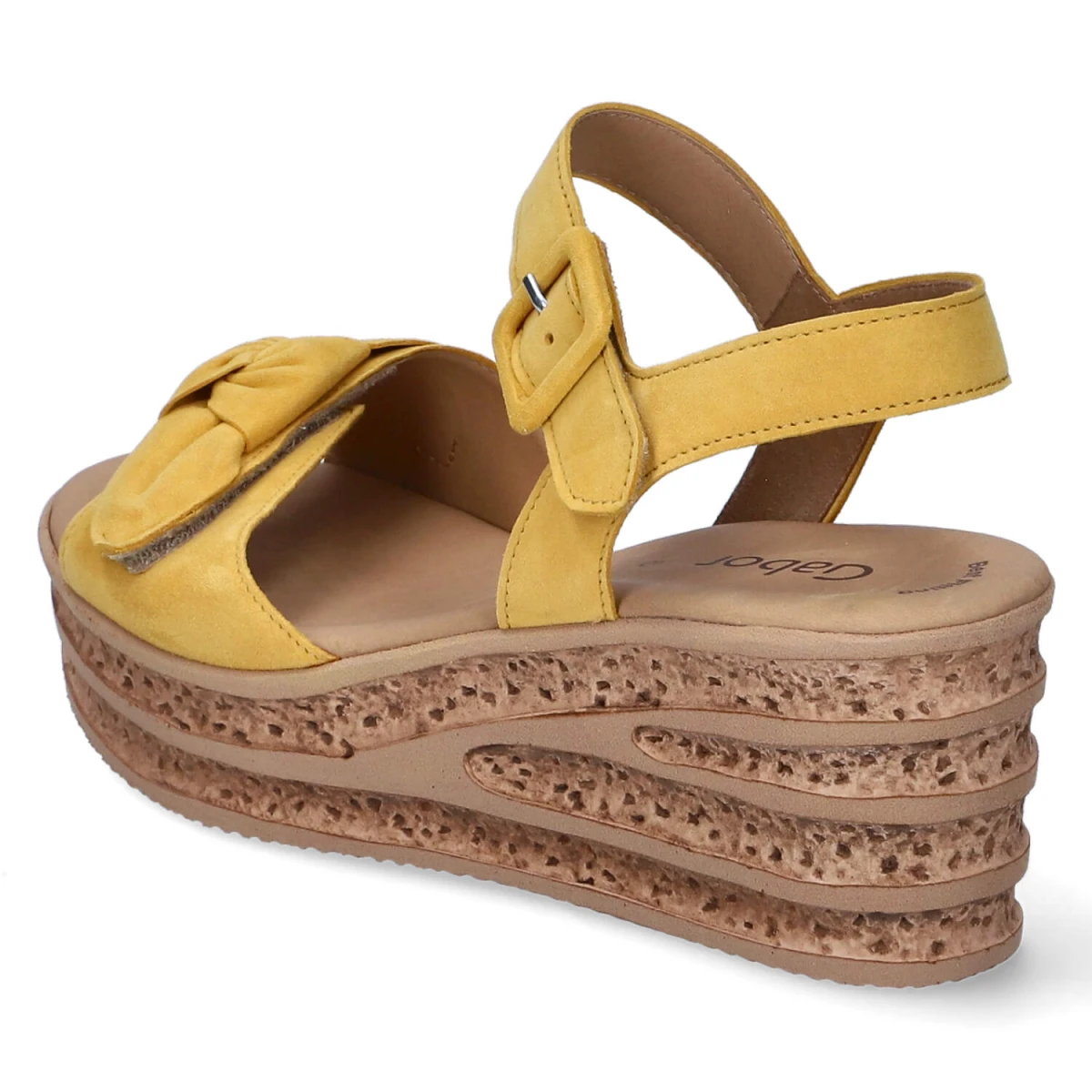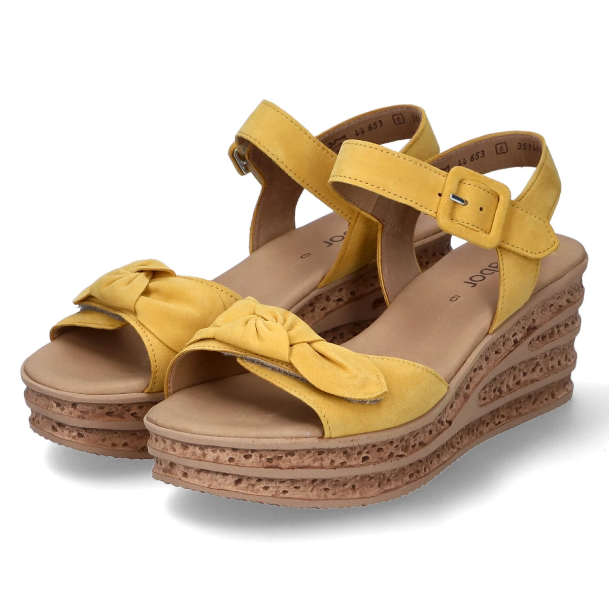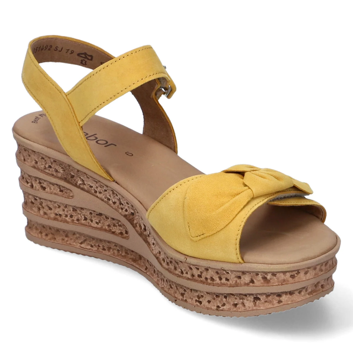 Sonnige Eleganz für warme Tage: Die Gabor Keilsandaletten vereinen langlebiges Echtleder in weichem Rauleder-Finish mit einer komfortablen Ausstattung. Die offene Schuhspitze setzt den Fuß stilvoll in Szene, während das gepolsterte Fußbett und die Lederdecksohle für ein angenehm weiches Auftreten sorgen. Durch mehrere praktische Klettverschlüsse lassen sich Passform und Halt individuell regulieren: ein Knöchelriemen mit Klett und Zierschnalle, dazu geflochtene Klettverschlussriemen über dem Spann. Der 7 cm hohe Keilabsatz in Korkoptik streckt die Silhouette und bleibt zugleich alltagstauglich. Das Modell fällt normal aus und bietet verlässliche Stabilität bei sommerlichen Unternehmungen. Modetipp: Zu Midikleid in Creme oder Jeansrock in Hellblau und einer Korbtasche entsteht ein frischer, urbaner Look, den goldfarbene Hoops harmonisch abrunden.