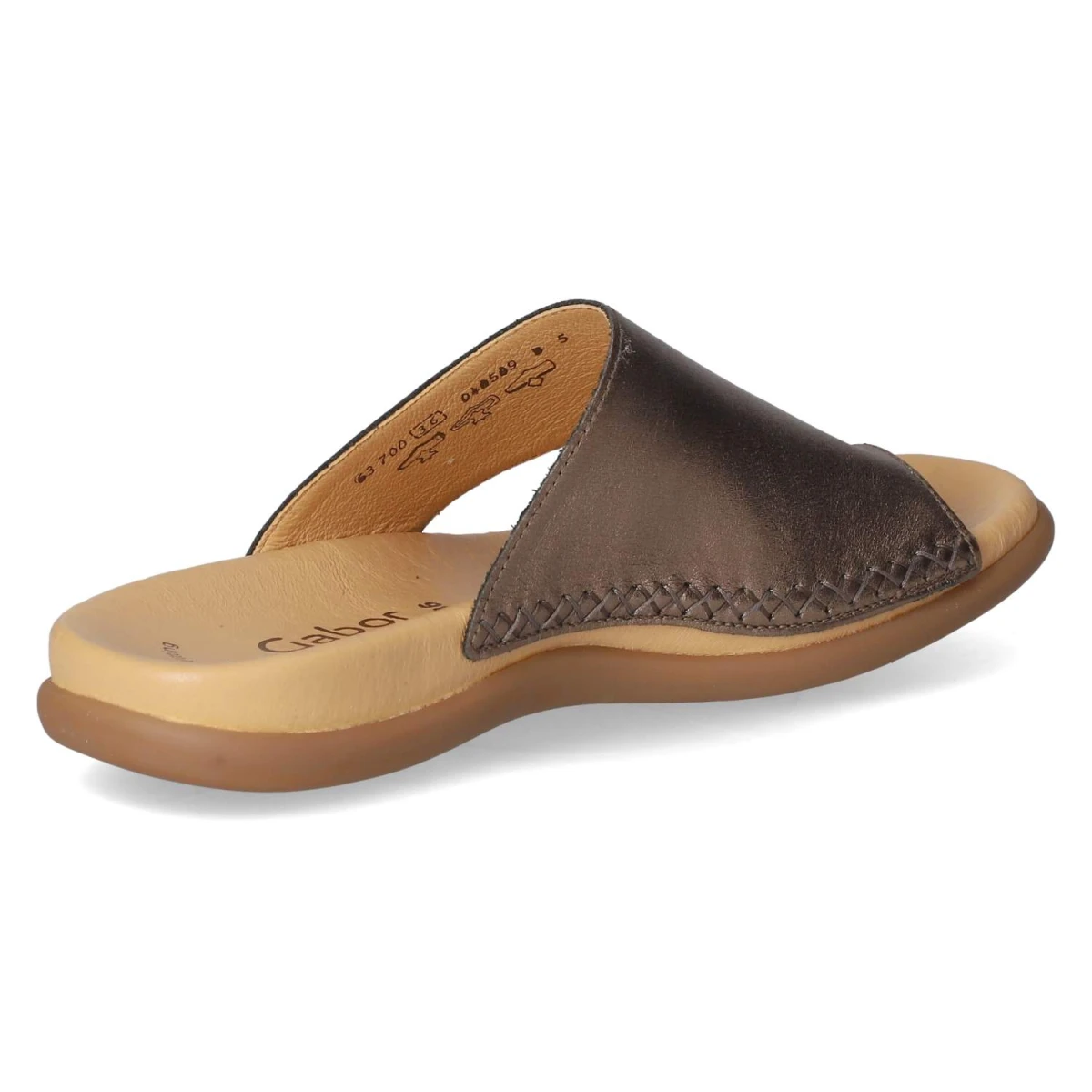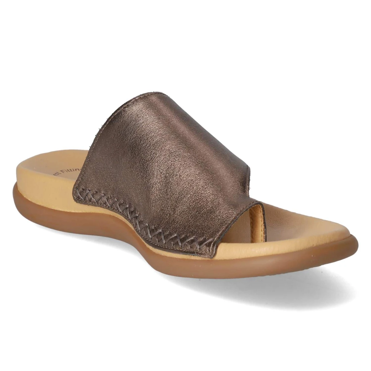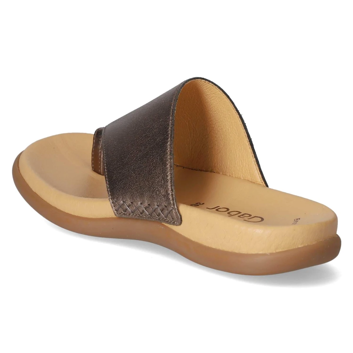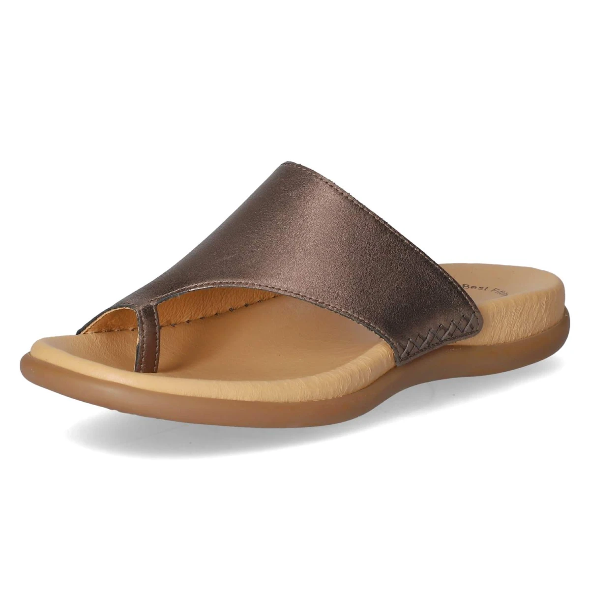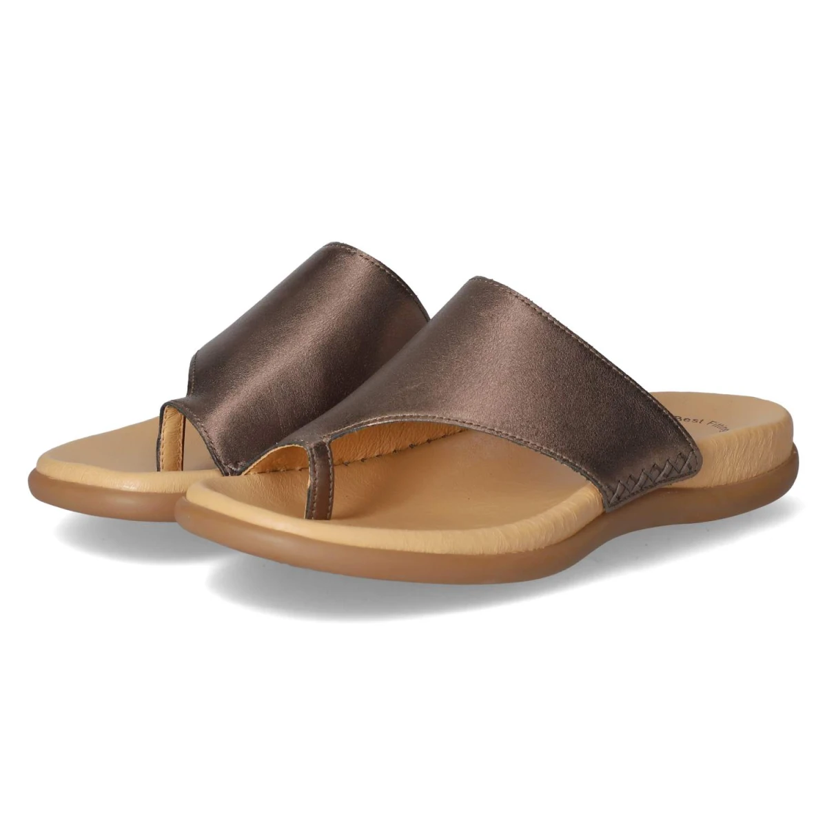 Der Gabor Zehentrenner vereint sommerliche Leichtigkeit mit edlem Finish. Das Obermaterial aus Glattleder zeigt sich in einem fein schimmernden Bronzeton, der durch rustikale Ziernähte im Kreuzstich stilvoll kontrastiert wird. Die offene Schuhspitze und der Verschlussverzicht sorgen für einen unkomplizierten Einstieg und luftigen Tragekomfort. Innen punktet eine hautfreundliche Lederdecksohle, darunter bietet das gepolsterte Lederfußbett sanfte Dämpfung für lange Tage in der Stadt oder am Strand. Die flexible, rutschfeste Laufsohle gibt verlässlichen Halt und macht jeden Schritt angenehm. Der Zehentrenner fällt normal aus und passt sich dank seiner klassischen Linienführung vielseitigen Outfits an. Modetipp: Der bronzefarbene Glanz harmoniert besonders schön mit weißen Leinenhosen und einer fließenden Bluse; dazu feiner Goldschmuck für einen eleganten Sommerlook.