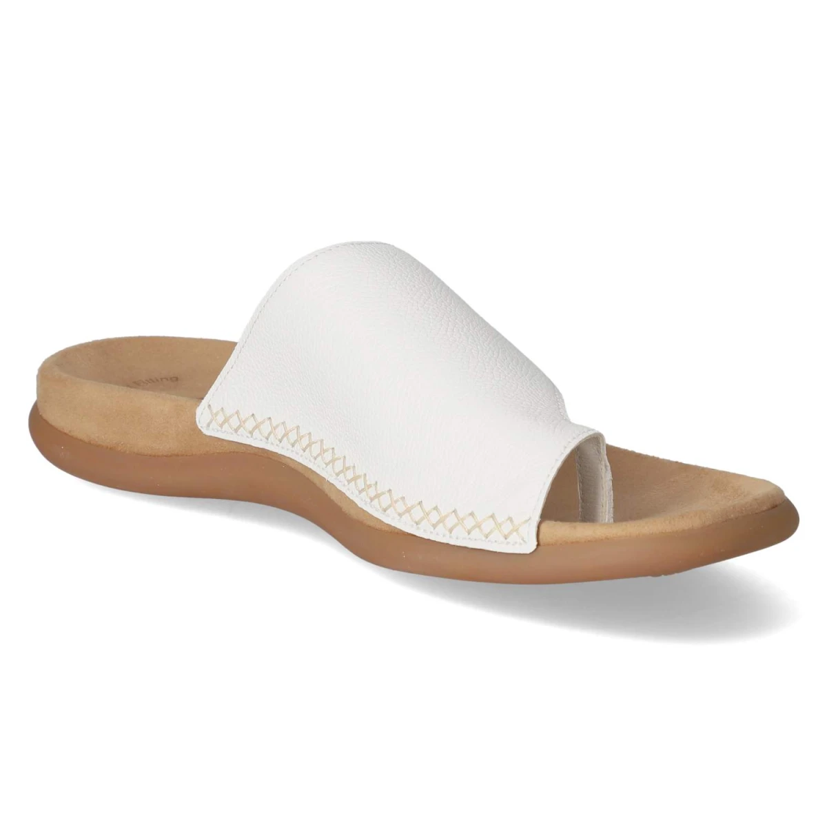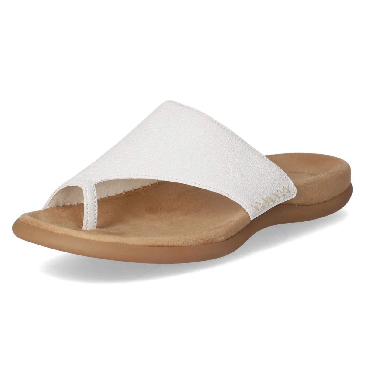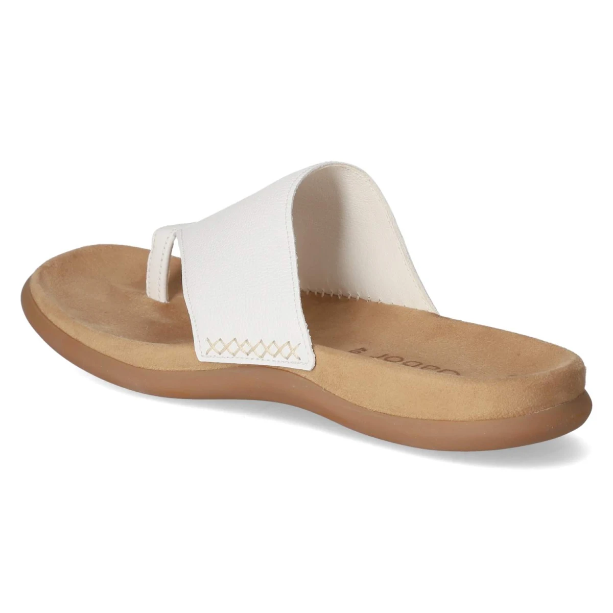 Der Gabor Zehentrenner für Damen zeigt sich in klarer Weißnuance und reduziertem Design. Langlebiges Echtleder in glatter Ausführung formt das Obermaterial, während die offen gehaltene Schuhspitze sommerliche Leichtigkeit unterstreicht. Die vorgeformte, textile Decksohle und das dämpfende Fußbett sorgen für angenehm gepolsterten Auftritt, die flexible Laufsohle mit Grip sichert Stabilität auf verschiedenem Untergrund. Dank „ohne Verschluss“ gelingt das Hineinschlüpfen mühelos, der Größenhinweis fällt normal aus. Seitlich setzt ein zierender Kreuzstich einen feinen Akzent. Die Farb- und Formgebung eröffnet vielseitige Kombinationsmöglichkeiten - von Citylooks bis Strandpromenade. Modetipp: Zu einer weißen Wide-Leg-Jeans und einem naturfarbenen Leinenhemd entsteht ein tonales Outfit, das die klare Ästhetik des Zehentrenners elegant aufgreift.
