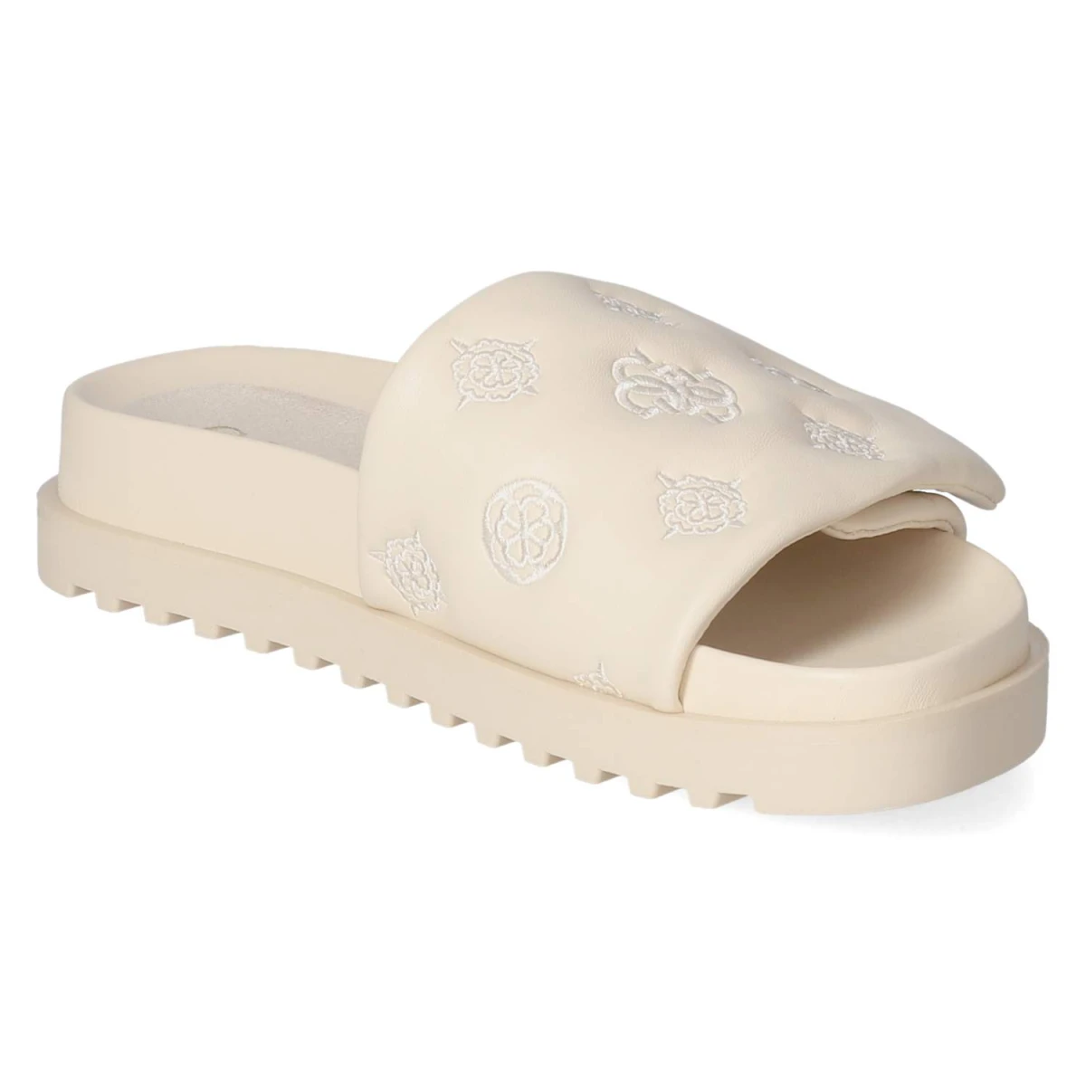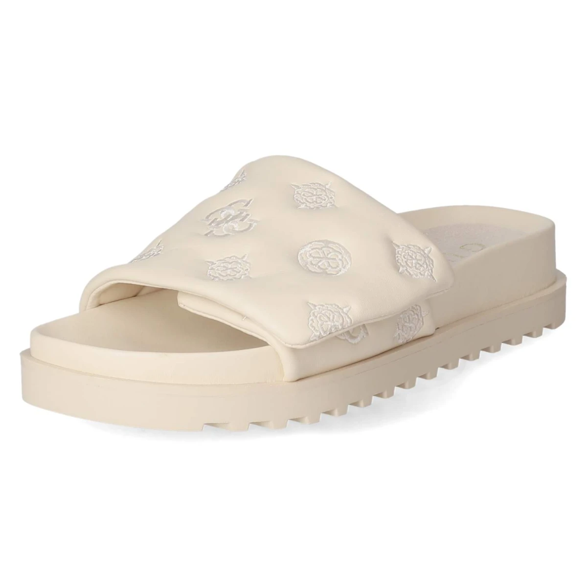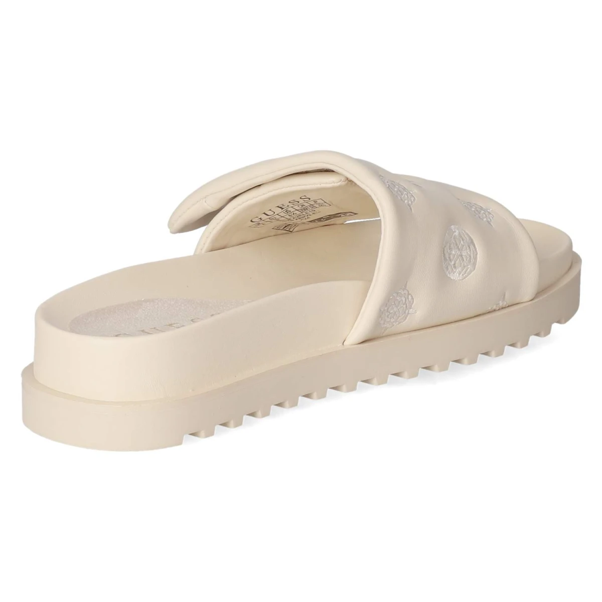 Diese Damen-Pantoletten von Guess in sanftem Beige verbinden lässige Eleganz mit hohem Tragekomfort. Das modern designte Obermaterial aus Synthetik präsentiert eine klare Linienführung und eine offene Schuhspitze, die luftig und zeitgemäß wirkt. Ein vorgeformtes, gepolstertes Fußbett mit Decksohle aus Textil und Synthetik sorgt für weiche Dämpfung, während die flexible, rutschhemmende Laufsohle zuverlässigen Halt bietet. Der bequeme Klettverschluss erlaubt ein schnelles Anpassen und hält den Fuß sicher, ohne aufzutragen. Aufgestickte Markendetails setzen einen dezenten Akzent, der sowohl im Alltag als auch auf Reisen überzeugt. Der Schnitt fällt normal aus und erleichtert die Größenauswahl. Modetipp: Ton-in-Ton zu Leinen in Creme oder Sand getragen entsteht ein monochromes Sommer-Statement, perfekt mit einer filigranen Goldkette und einer strukturierten Mini-Bag.