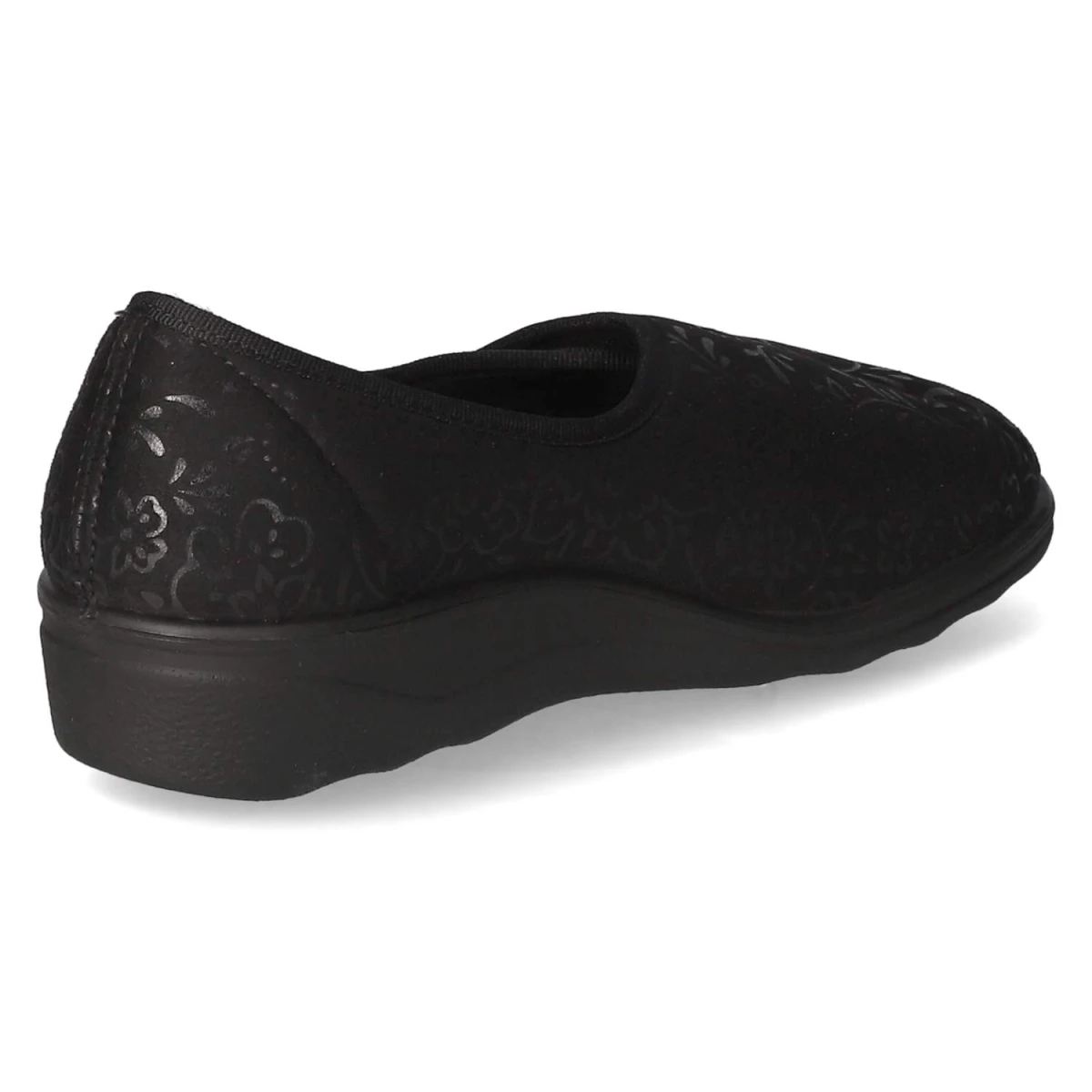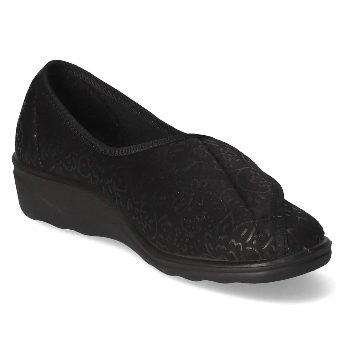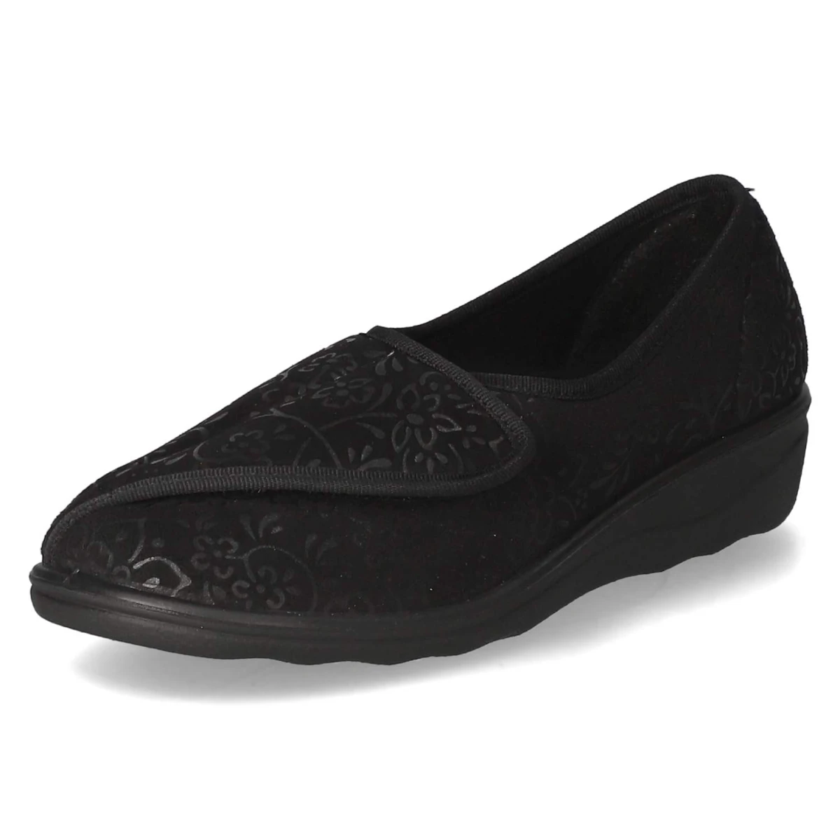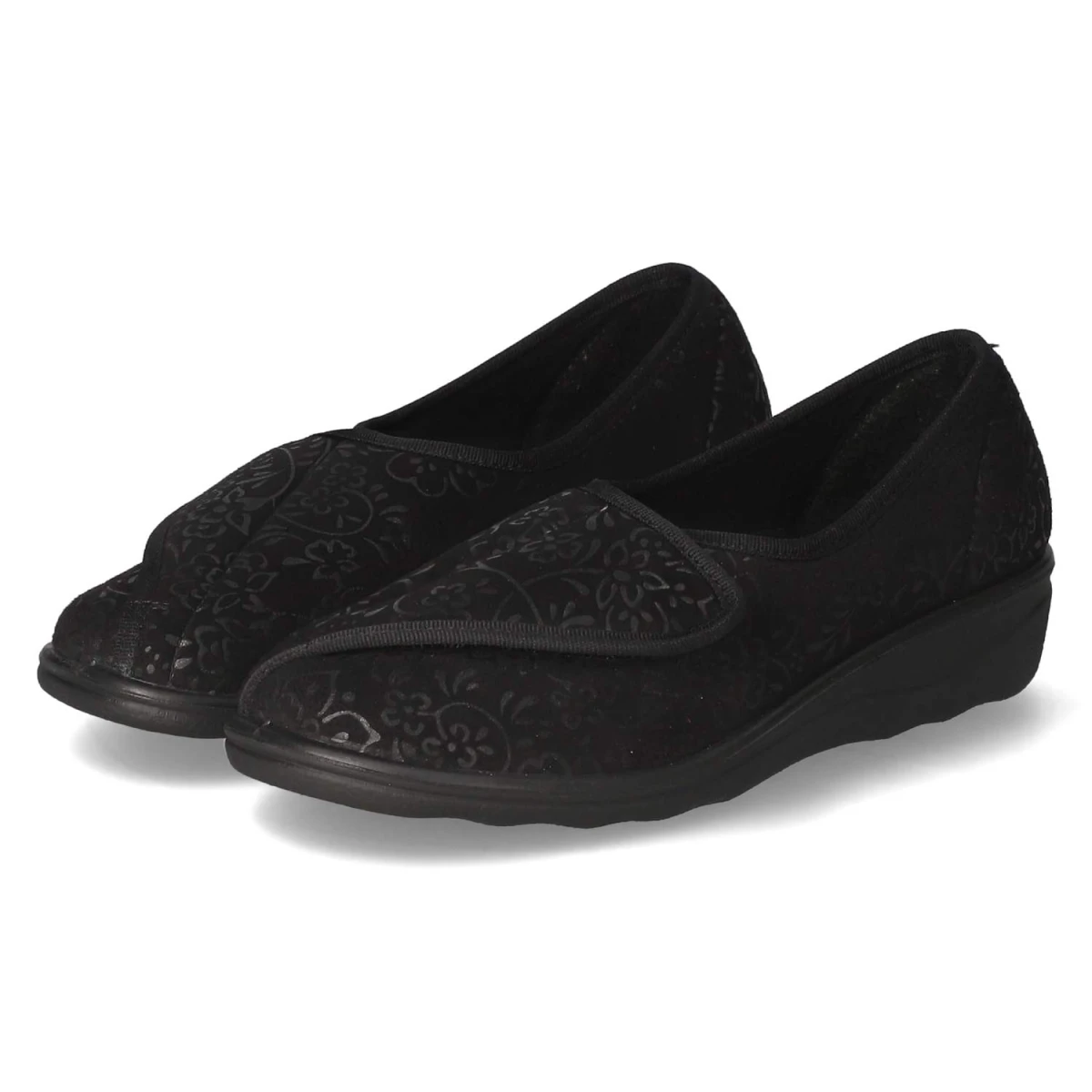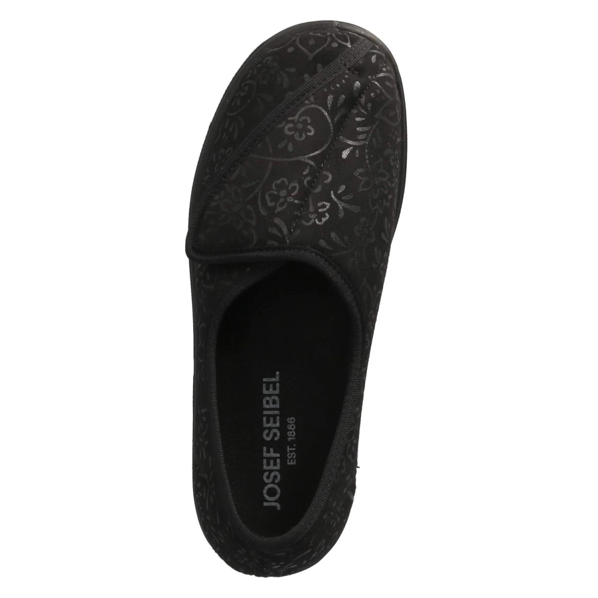 Die Hausschuhe NICE 104 von Josef Seibel verbinden behaglichen Komfort mit dezentem Stil. Das leichte Textilobermaterial in Schwarz schmiegt sich angenehm an und wird von einem schimmernden floralen Muster elegant akzentuiert. Dank rund gearbeiteter Schuhspitze und gepolsterter Decksohle entsteht ein weiches Auftrittsgefühl, das selbst lange Abende auf den Beinen entspannt. Das angenehme Textilfutter sorgt für ein ausgeglichenes Klima, während die flexible Laufsohle leise und anpassungsfähig bleibt. Der bequeme Klettverschluss ermöglicht eine schnelle, individuell regulierbare Passform, die durch die verstärkte Ferse stabil geführt wird. Das Modell fällt normal aus und bietet zuverlässigen Halt im Alltag daheim. Modetipp: Zu einem feinen Strickset in Anthrazit und weichen Kuschelsocken in Ton-in-Ton wirkt das dezente Schwarz besonders edel.