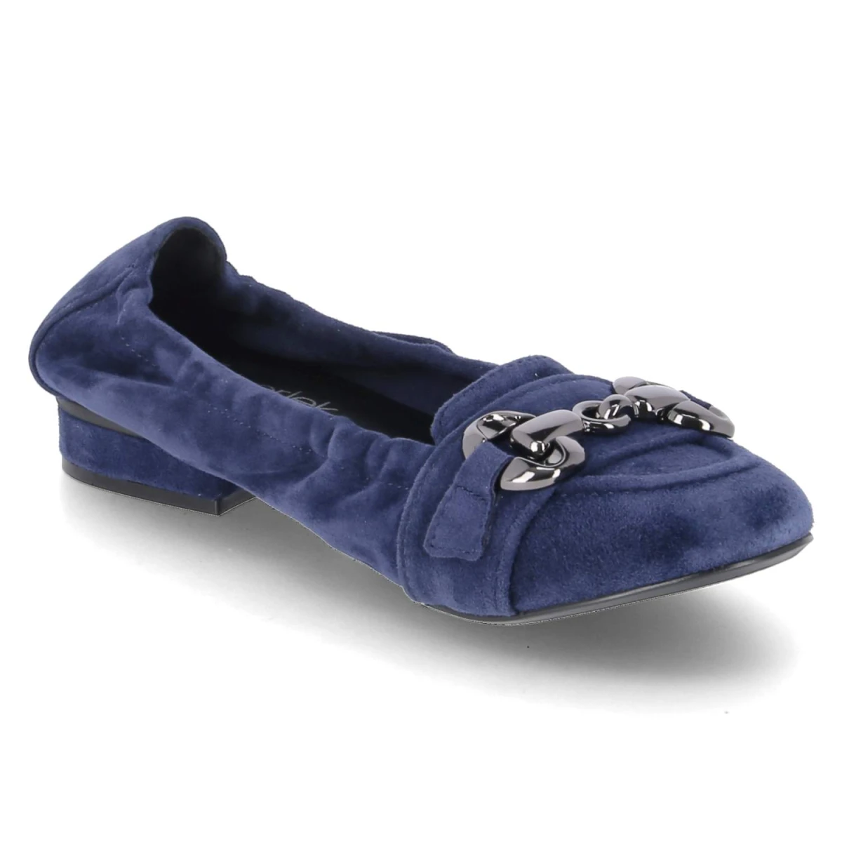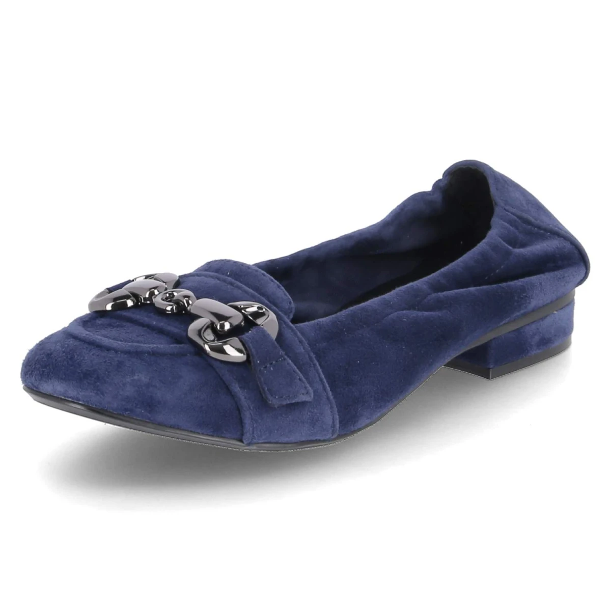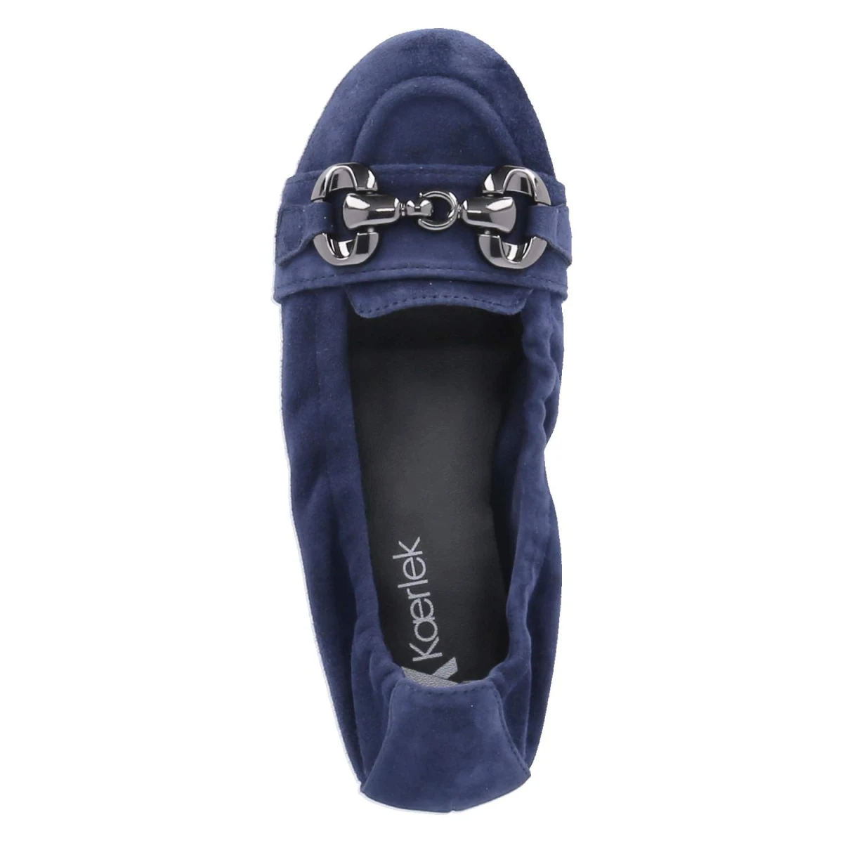 Eleganter Alltagsbegleiter mit Komfortfaktor: Der Ballerina von Kaerlek zeigt sich in edlem Blau und kombiniert zeitlose Linien mit durchdachten Details. Das Obermaterial aus langlebigem Rauleder schmiegt sich weich an, während die verstärkte Ferse und die runde Spitze für formstabilen Halt und eine feminine Silhouette sorgen. Ein elastischer Einstieg erleichtert das Hineinschlüpfen, die gepolsterte Lederdecksohle verwöhnt mit sanfter Dämpfung. Der 2 cm hohe Blockabsatz entlastet dezent und unterstützt einen sicheren Gang, verstärkt durch die sehr flexible, rutschhemmende Laufsohle. Markantes Highlight ist der über dem Spann verlaufende Zierriemen samt kleiner Zunge und Metallelement in glänzender Titanoptik. Ohne Verschluss gehalten, fällt das Modell normal aus und punktet im Tagesverlauf mit hoher Bequemlichkeit. Modetipp: Zum cropped Jeans-Anzug oder zu Midikleidern in Creme erzeugt das Blau einen ruhigen, modernen Kontrast.
