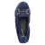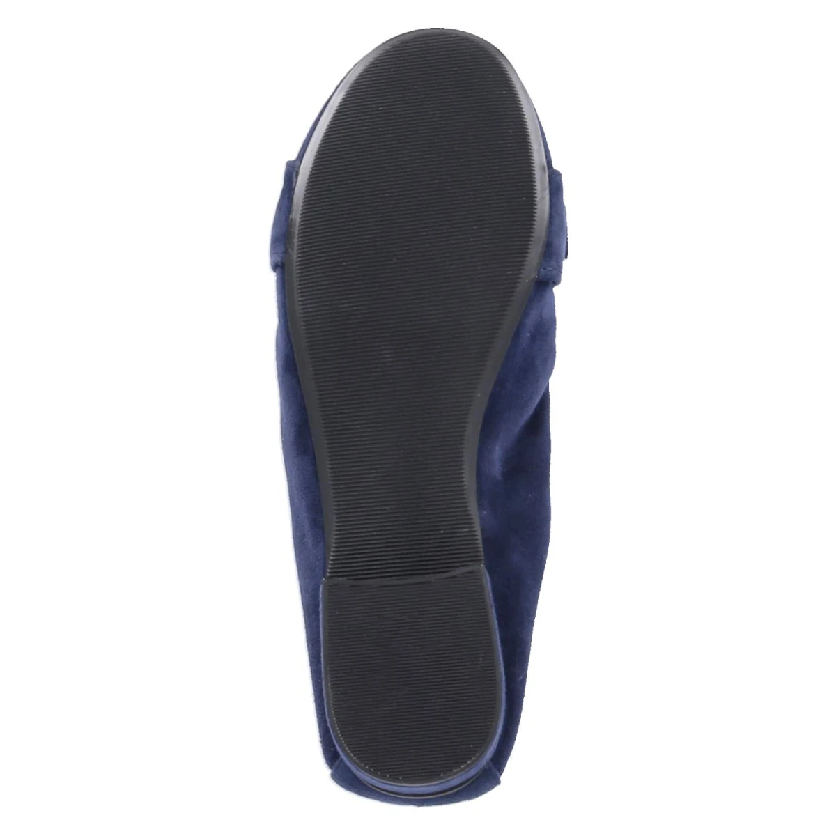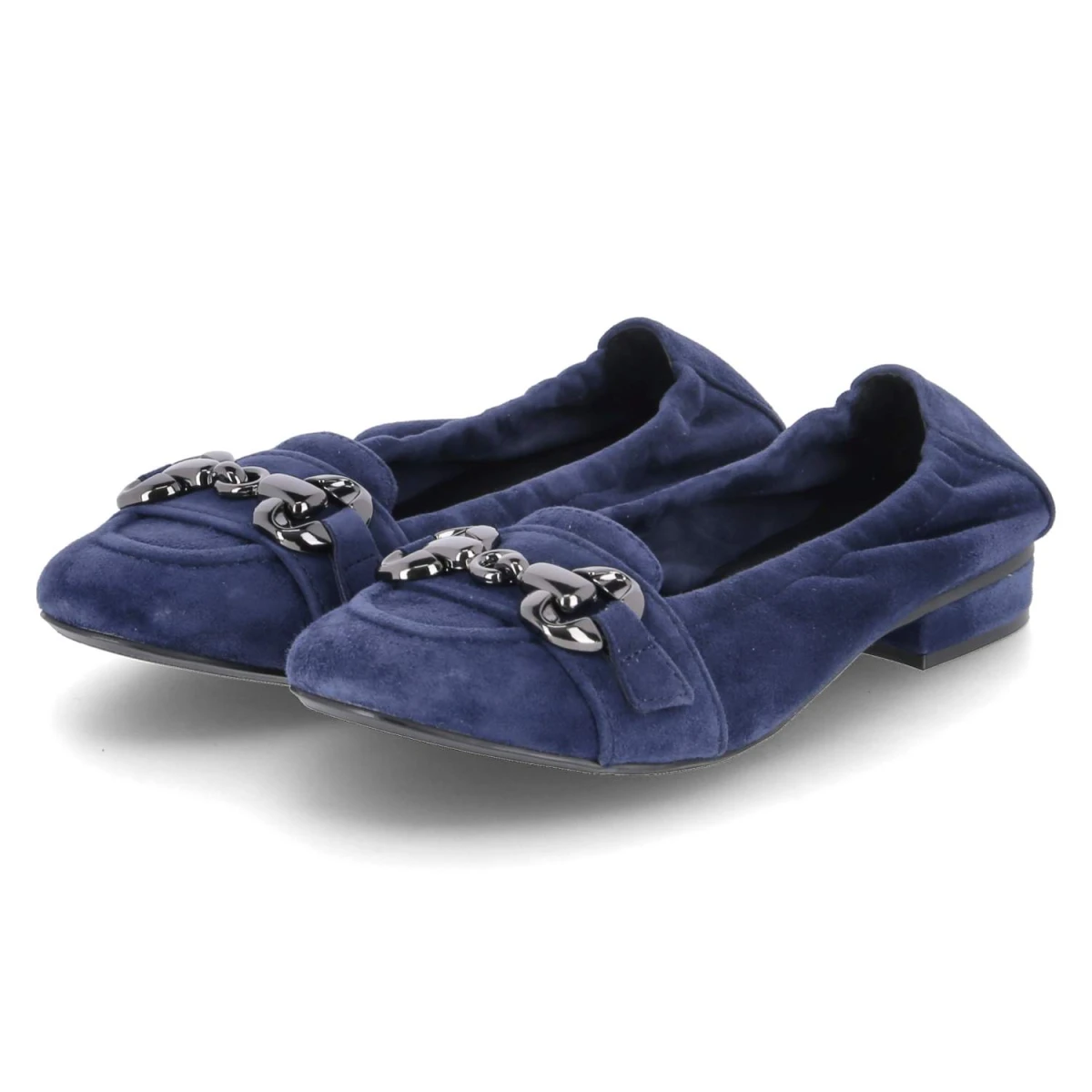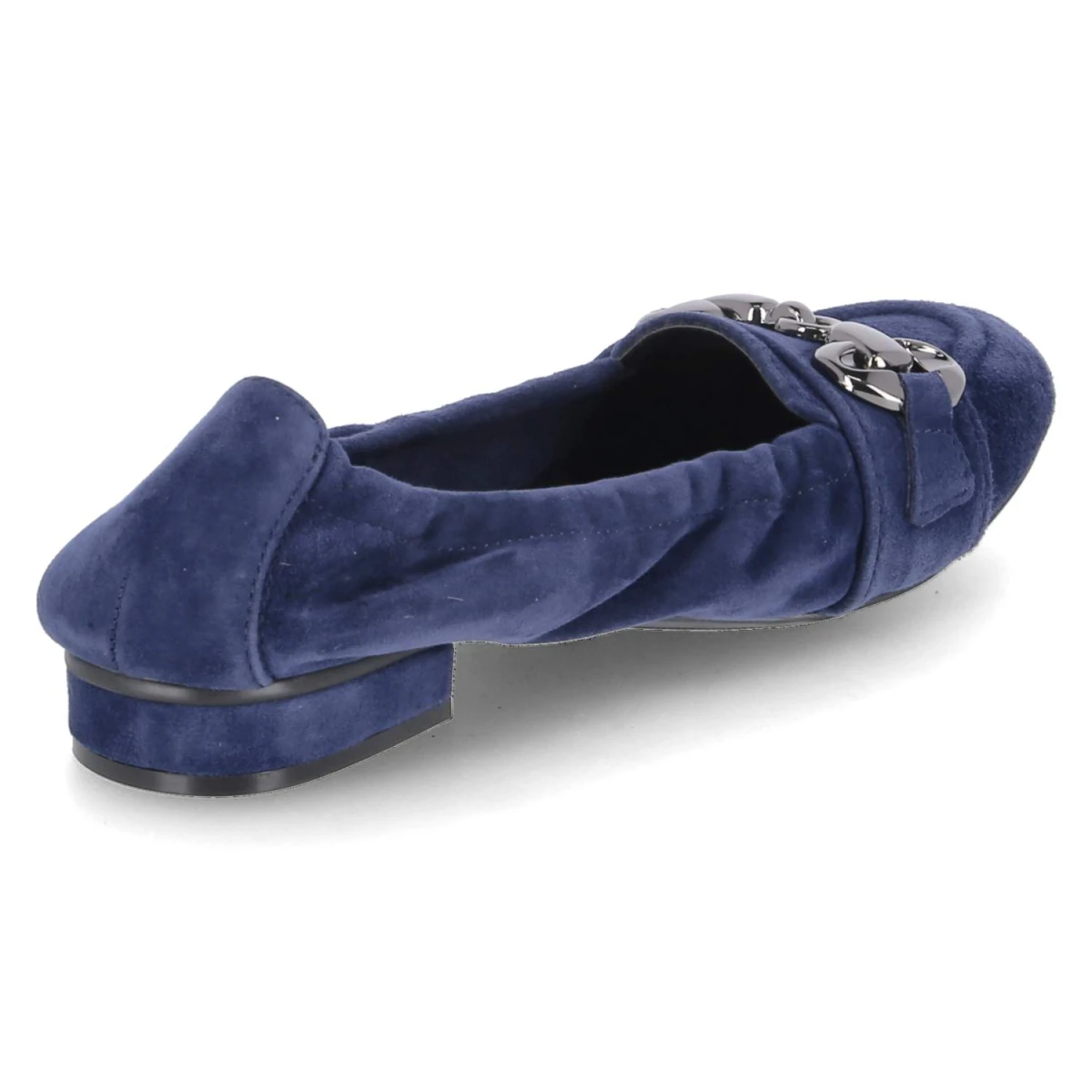 Eleganter Alltagsbegleiter mit Komfortfaktor: Der Ballerina von Kaerlek zeigt sich in edlem Blau und kombiniert zeitlose Linien mit durchdachten Details. Das Obermaterial aus langlebigem Rauleder schmiegt sich weich an, während die verstärkte Ferse und die runde Spitze für formstabilen Halt und eine feminine Silhouette sorgen. Ein elastischer Einstieg erleichtert das Hineinschlüpfen, die gepolsterte Lederdecksohle verwöhnt mit sanfter Dämpfung. Der 2 cm hohe Blockabsatz entlastet dezent und unterstützt einen sicheren Gang, verstärkt durch die sehr flexible, rutschhemmende Laufsohle. Markantes Highlight ist der über dem Spann verlaufende Zierriemen samt kleiner Zunge und Metallelement in glänzender Titanoptik. Ohne Verschluss gehalten, fällt das Modell normal aus und punktet im Tagesverlauf mit hoher Bequemlichkeit. Modetipp: Zum cropped Jeans-Anzug oder zu Midikleidern in Creme erzeugt das Blau einen ruhigen, modernen Kontrast.