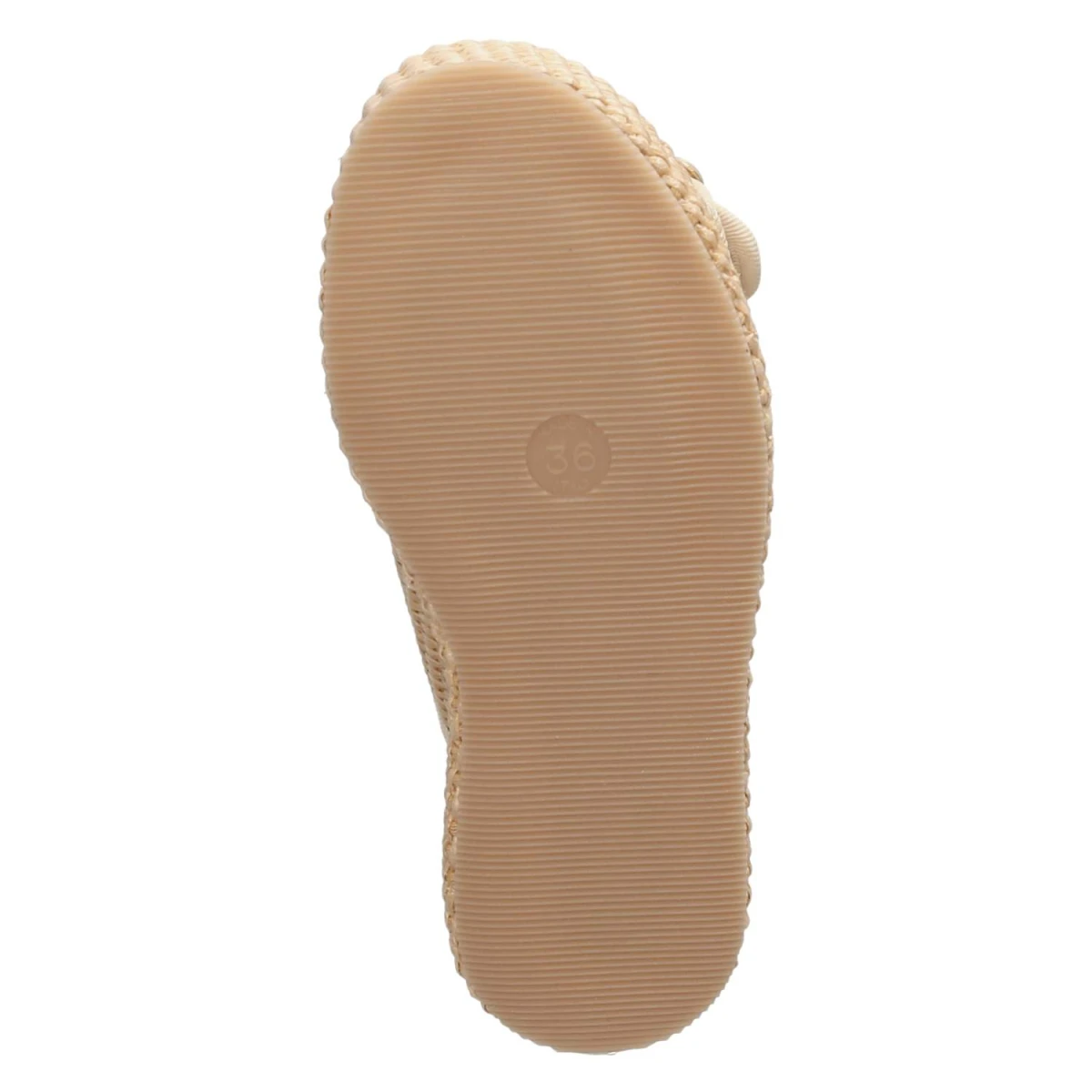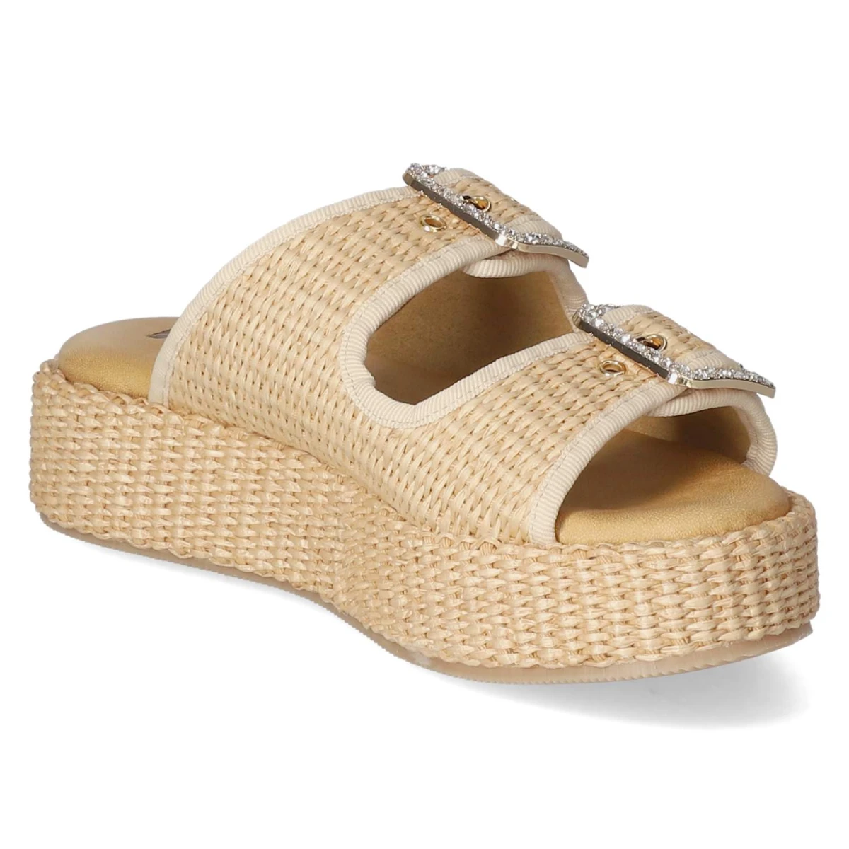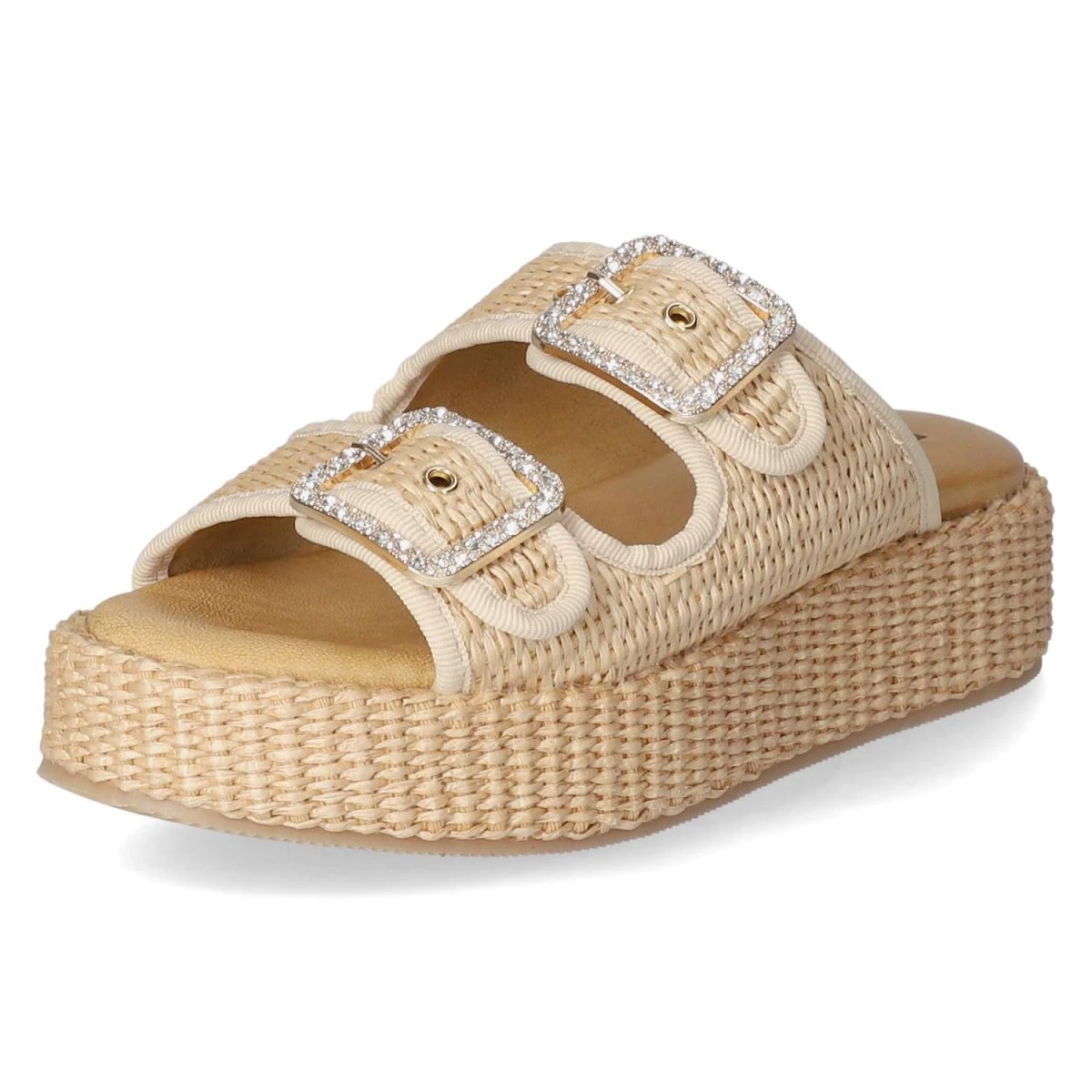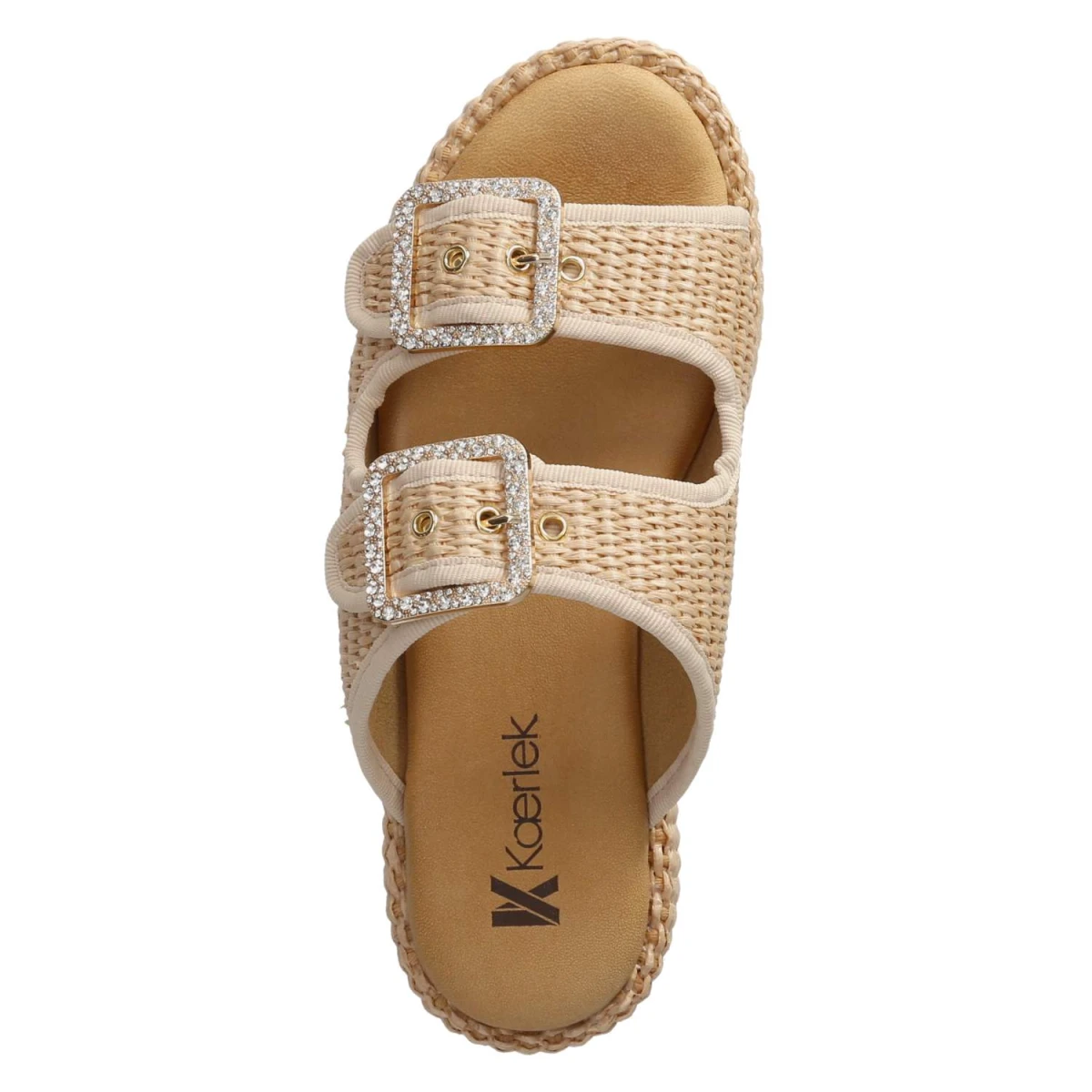 Die Pantoletten NATURALE von Kaerlek verbinden sommerliche Leichtigkeit mit modernem Design. Das beige Obermaterial aus hochwertig modern designter Synthetik zeigt eine feine Sisaloptik, die zusammen mit dem 4,5 cm hohen Plateau eine natürliche Textur und angenehme Höhe bringt. Die offene Schuhspitze unterstreicht den luftig-freien Charakter, während zwei goldfarbene Schnallen mit glitzernden Schmucksteinen einen eleganten Akzent setzen. Dank sicherer Schnallen lässt sich die Weite individuell anpassen, das gepolsterte Fußbett und die Decksohle aus Leder sorgen für dauerhaften Tragekomfort. Die Passform fällt normal aus und begleitet mühelos durch Alltag und Stadtbummel. Modetipp: zu fließenden Leinenkleidern oder Culottes und einer Basttasche kombinieren - die neutrale Beige-Nuance und die Sisaloptik harmonieren perfekt mit natürlichen Materialien.