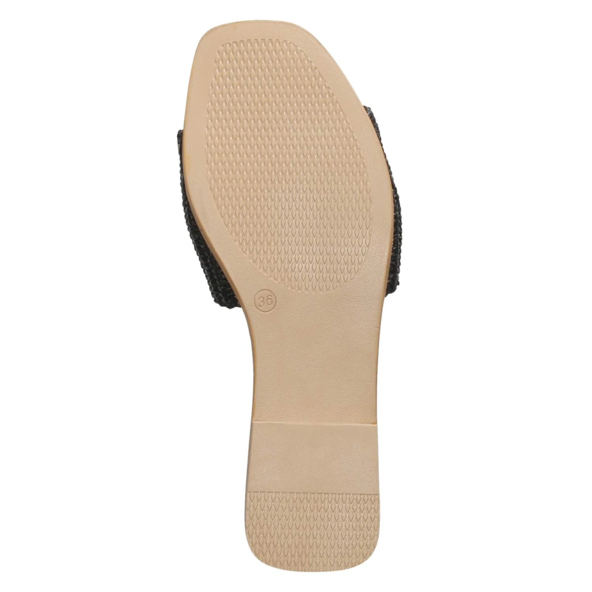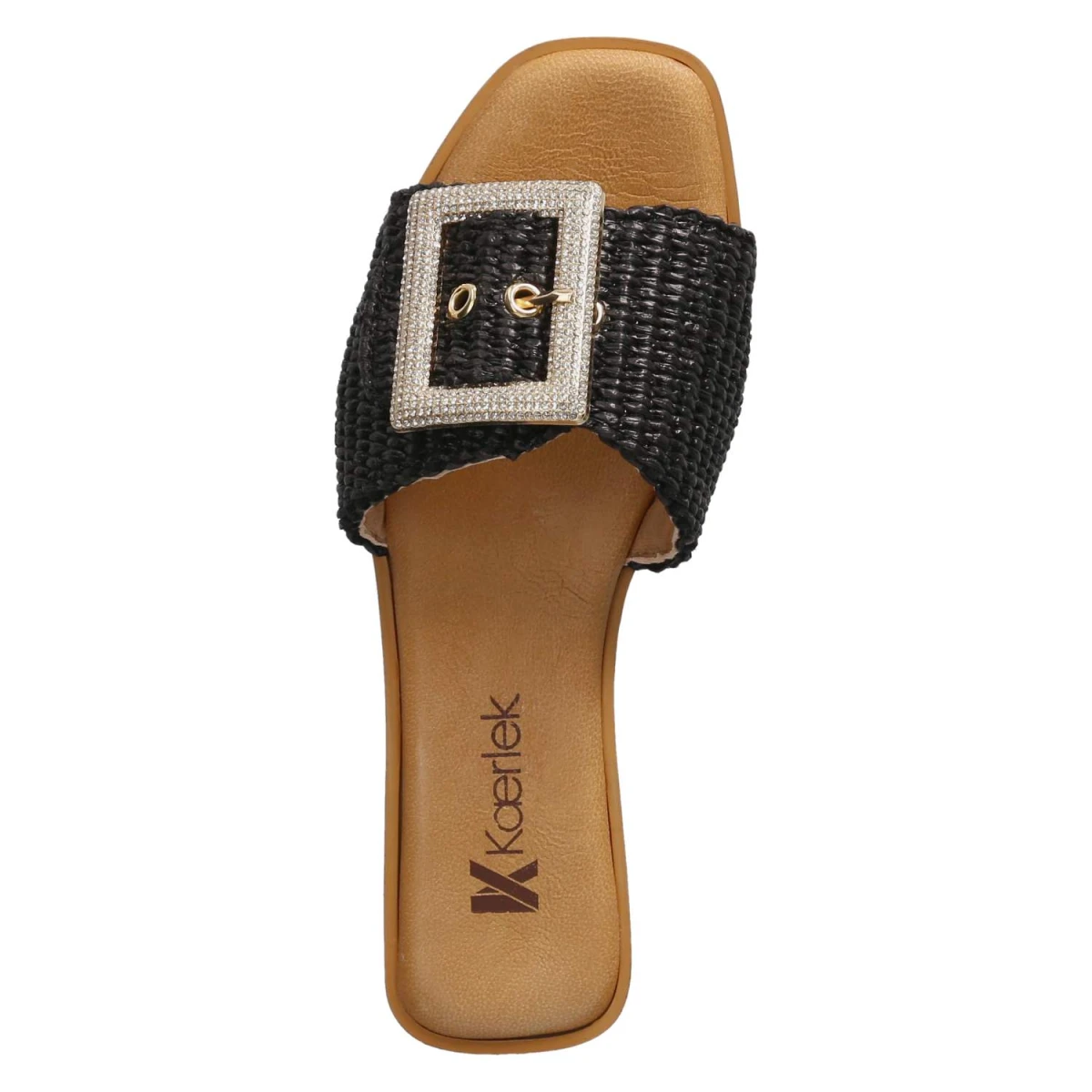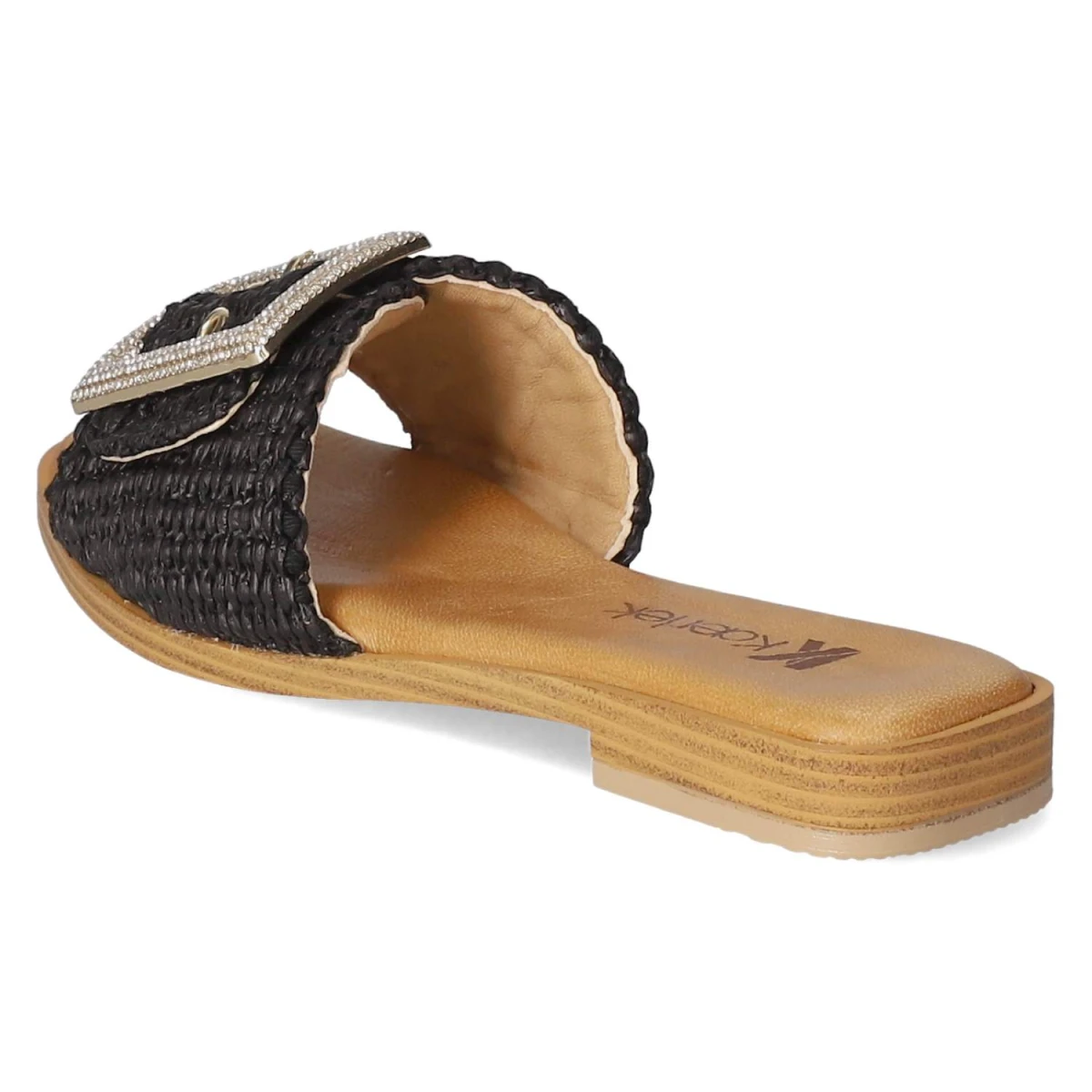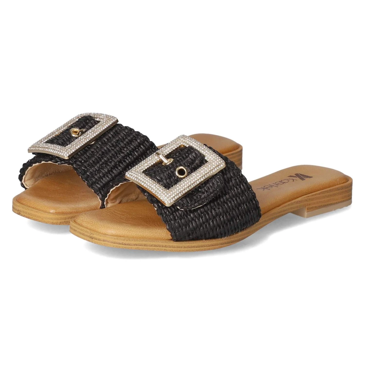 Die Pantoletten NERO von Kaerlek verbinden zurückhaltende Eleganz mit sommerlicher Struktur. Das schwarze Obermaterial aus Synthetik setzt den modernen Material-Mix in Szene, während die geflochtene Sisaloptik an der Sohle einen natürlichen Akzent liefert. Die goldfarbene Schnalle mit funkelnden Schmucksteinen ist nicht nur ein Blickfang, sondern erlaubt ein unkompliziertes Anpassen. Ein weich gepolstertes Fußbett mit Decksohle aus Leder sorgt für angenehmen Komfort, die flexible, rutschhemmende Laufsohle für verlässlichen Halt. Mit offener Schuhspitze und normal ausfallender Passform eignen sich die Pantoletten für vielfältige Anlässe vom Café bis zur Strandpromenade. Modetipp: Zu Leinen-Set in Sand und schwarzem Top kombinieren, dazu filigraner Goldschmuck und eine Bast-Clutch für ein harmonisches Finish.