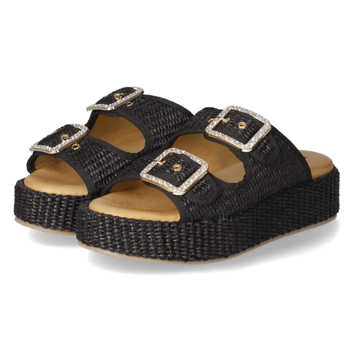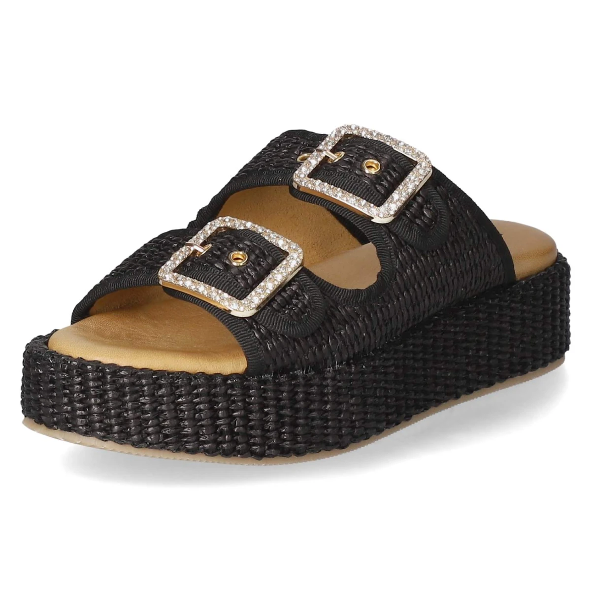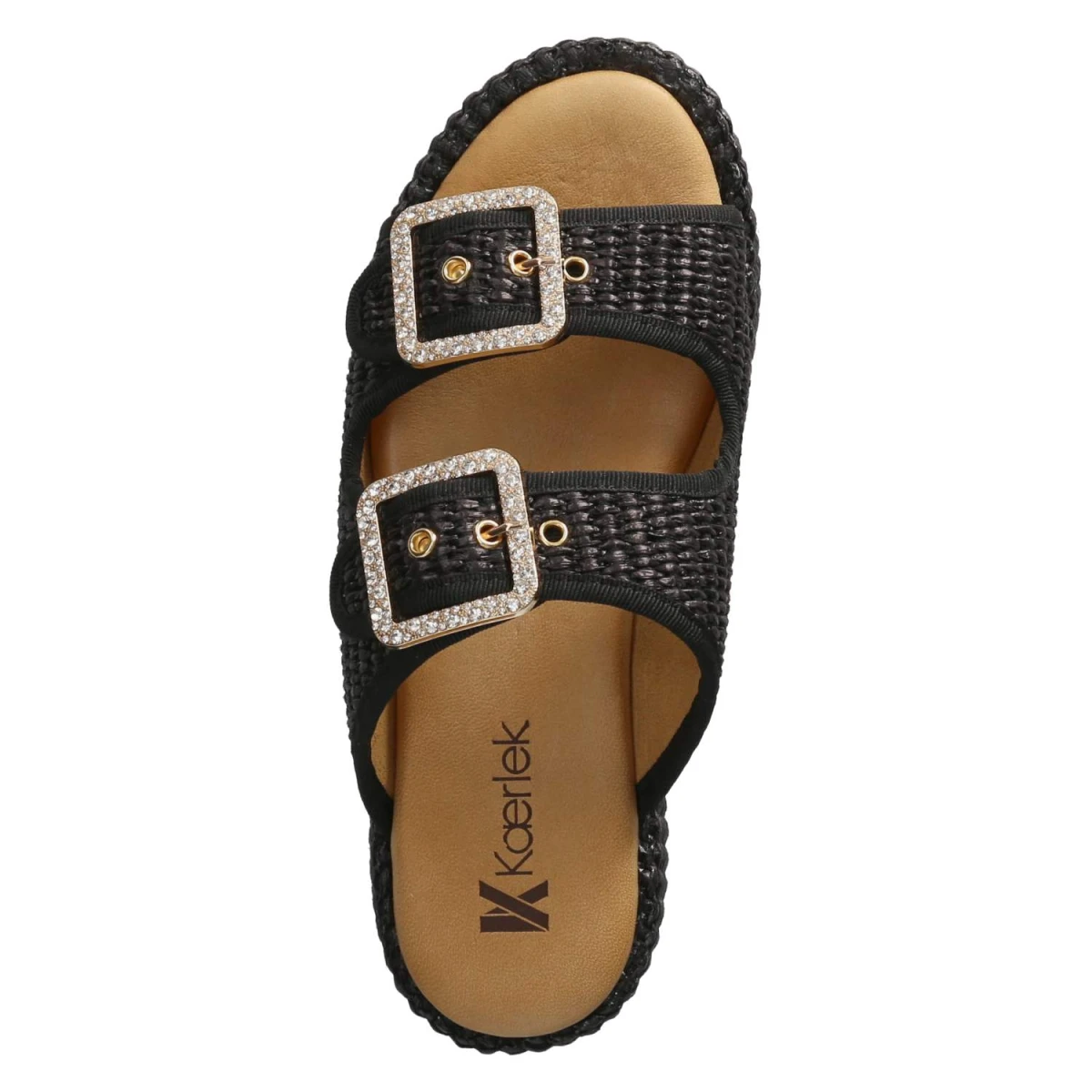 Pantoletten NERO von Kaerlek verbinden moderne Optik mit komfortabler Konstruktion. Das schwarze Modell setzt auf eine 4,5 cm hohe Plateau-Absatzform, die die Silhouette dezent streckt und dank breiter Auflagefläche stabil wirkt. Zwei goldfarbene Schnallen mit funkelnden Schmucksteinen verleihen Glamour; Details in Sisaloptik bringen sommerliche Struktur. Ein modern designtes Obermaterial aus Synthetik trifft auf eine Decksohle aus Leder, während das weich gepolsterte Fußbett angenehmen Halt schenkt. Die offene Schuhspitze unterstreicht die luftige Anmutung, der verstellbare Schnallenverschluss sorgt für passgenauen Sitz. Das Modell für Damen fällt normal aus und überzeugt im Alltag ebenso wie abends. Modetipp: Besonders edel wirkt die Pantolette zu einem monochromen Schwarz-Look mit goldenen Accessoires oder zu Raw-Denim und weißem Oversize-Hemd.