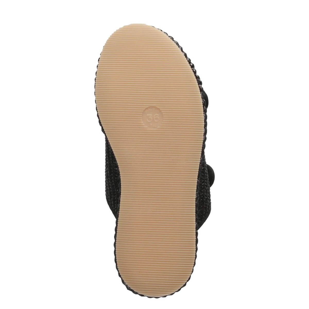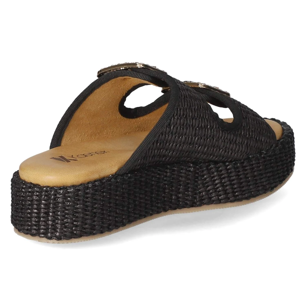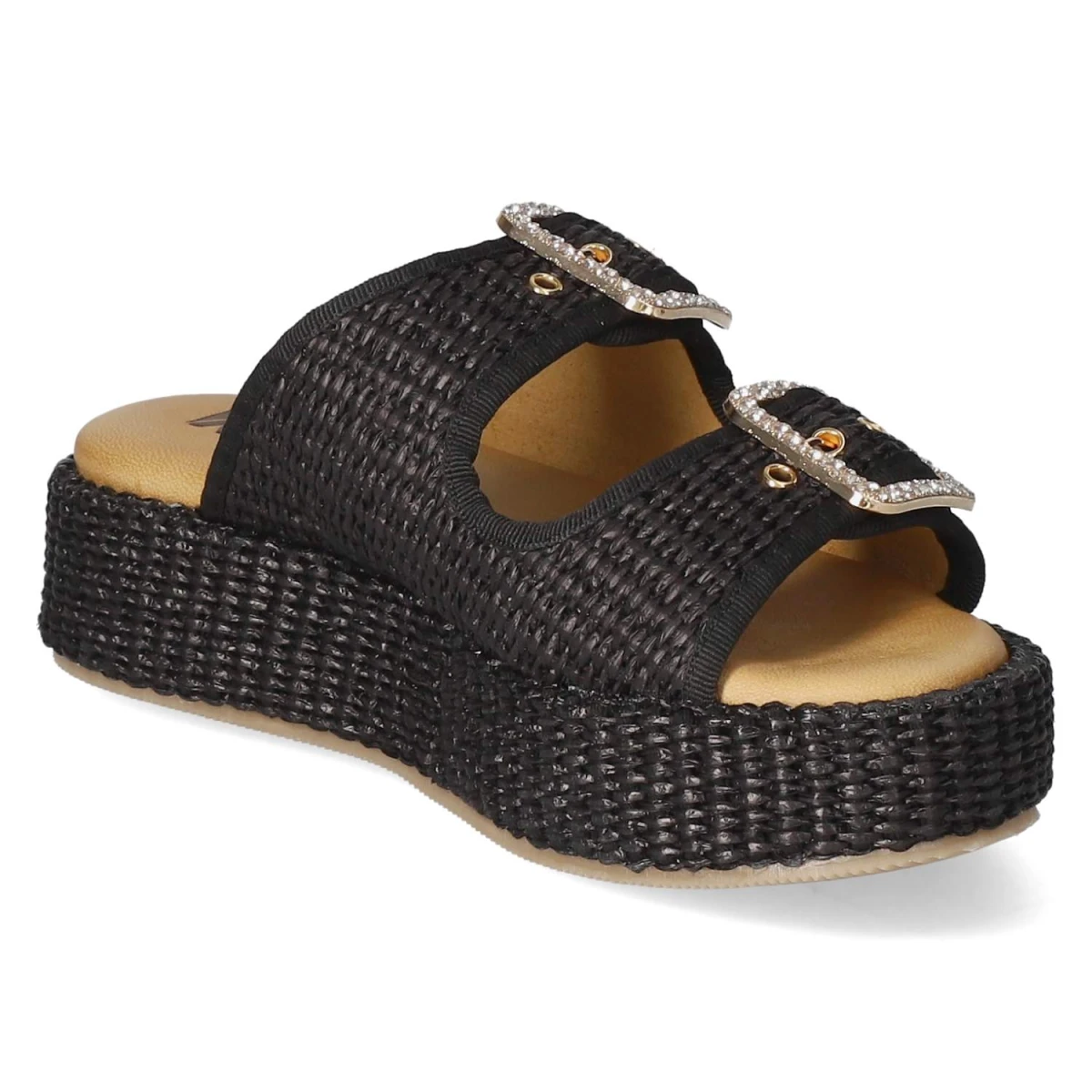Pantoletten NERO von Kaerlek verbinden moderne Optik mit komfortabler Konstruktion. Das schwarze Modell setzt auf eine 4,5 cm hohe Plateau-Absatzform, die die Silhouette dezent streckt und dank breiter Auflagefläche stabil wirkt. Zwei goldfarbene Schnallen mit funkelnden Schmucksteinen verleihen Glamour; Details in Sisaloptik bringen sommerliche Struktur. Ein modern designtes Obermaterial aus Synthetik trifft auf eine Decksohle aus Leder, während das weich gepolsterte Fußbett angenehmen Halt schenkt. Die offene Schuhspitze unterstreicht die luftige Anmutung, der verstellbare Schnallenverschluss sorgt für passgenauen Sitz. Das Modell für Damen fällt normal aus und überzeugt im Alltag ebenso wie abends. Modetipp: Besonders edel wirkt die Pantolette zu einem monochromen Schwarz-Look mit goldenen Accessoires oder zu Raw-Denim und weißem Oversize-Hemd.
