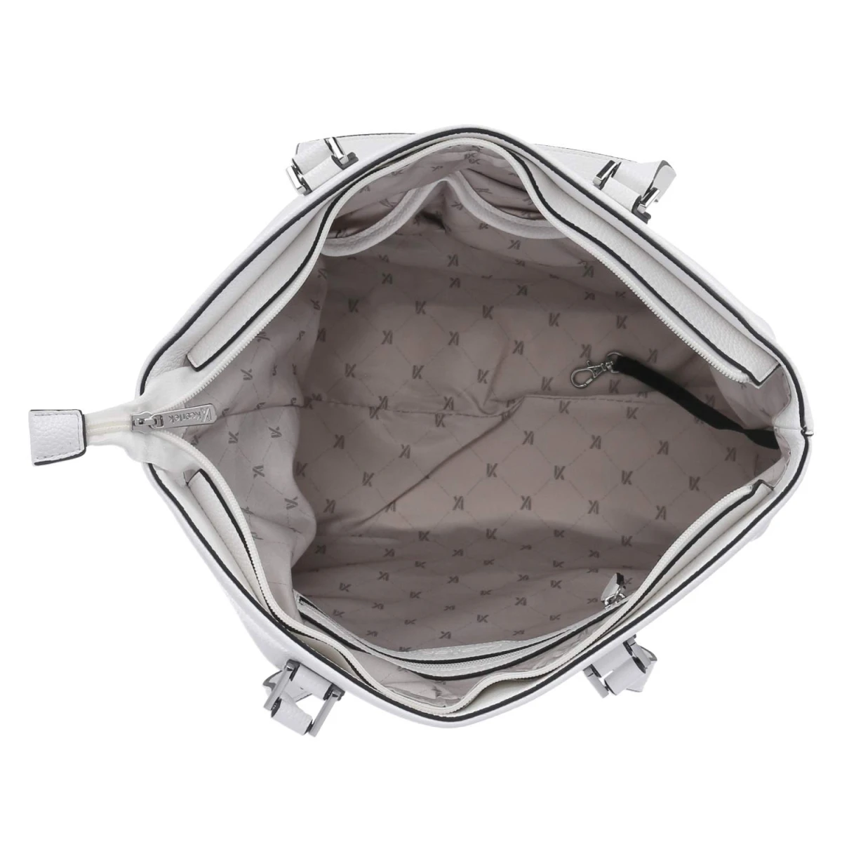 Dieser Shopper in strahlendem Weiß vereint klare Linien mit einer klug strukturierten Innenaufteilung. Mit ca. 28 x 32 x 12 cm und etwa 10 Litern Volumen begleitet die Handtasche mühelos durch Büro, Stadtbummel und Abendprogramm. Ein Reißverschlusshauptfach schützt Inhalte zuverlässig, hinten bietet ein weiteres Reißverschlussfach schnellen Zugriff auf Essentials. Innen sorgen ein Reißverschlussfach, zwei Steckfächer und zwei Stiftplätze für Übersicht, das Schlüsselband mit Karabiner hält den Schlüsselbund sicher an Ort und Stelle. Feste Henkel von ca. 60 cm tragen angenehm über Schulter oder Arm, der verstärkte Boden mit Metallfüßchen bewahrt die Form und schont Oberflächen. Das weiße Finish bringt frische Eleganz in sportliche und formelle Looks. Modetipp: Zu monochromen Outfits in Creme und Taupe kombinieren, dazu zarte Gold-Details für einen modernen Ton-in-Ton-Effekt.