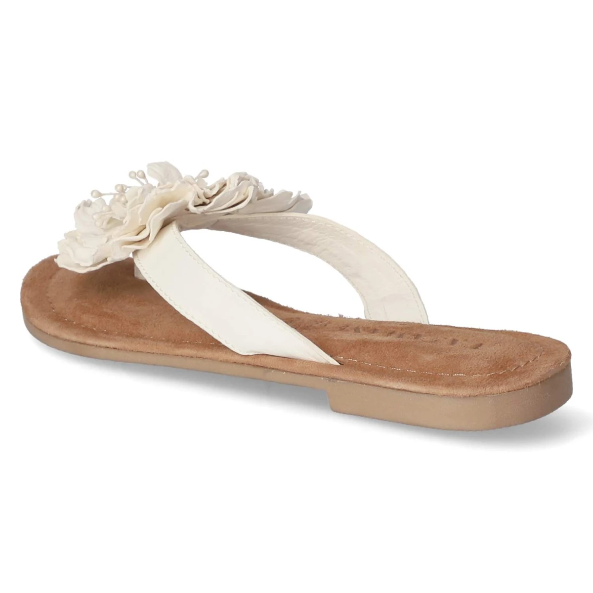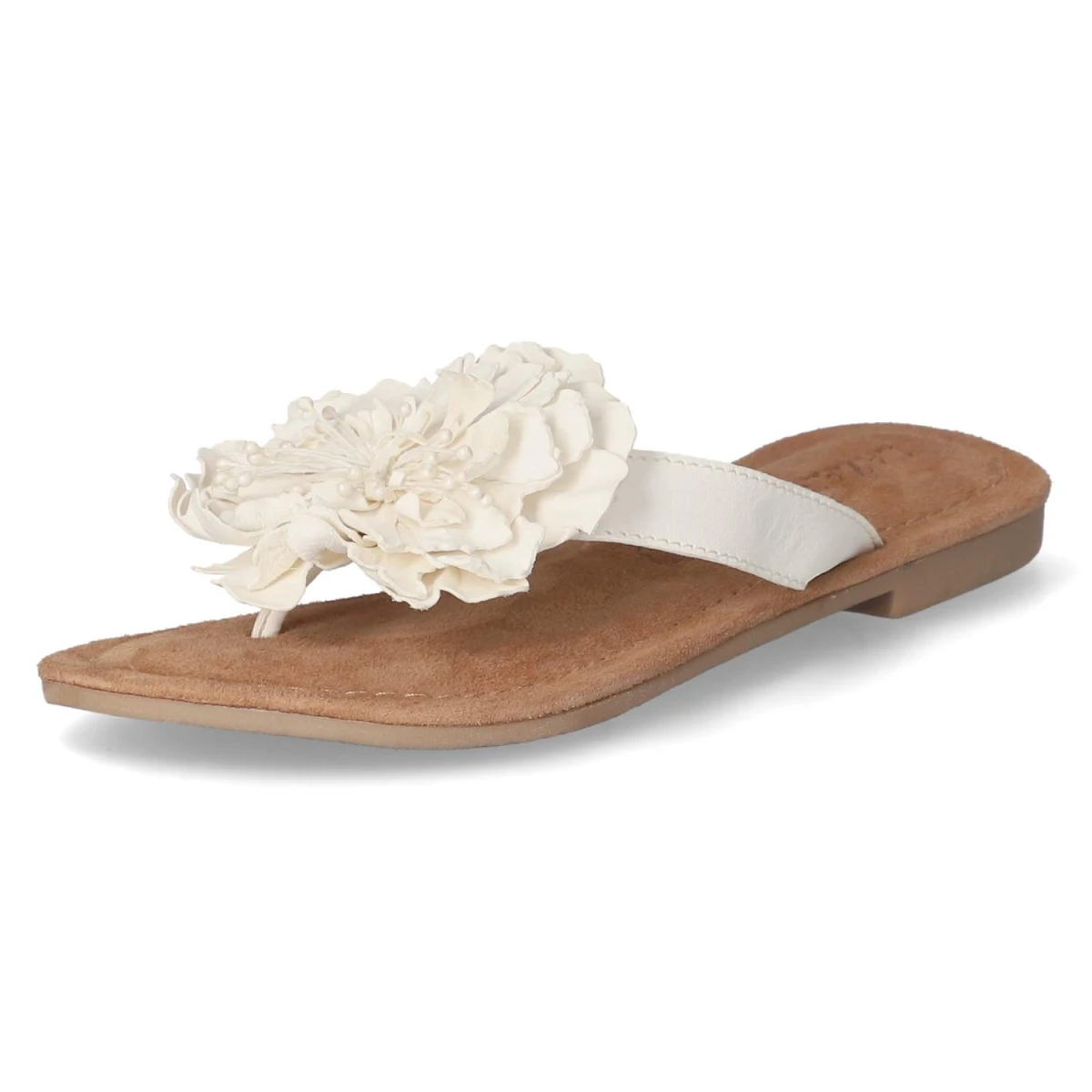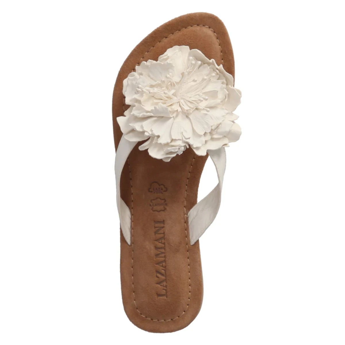 Der LAZAMANI Zehentrenner in strahlendem Weiß verbindet festliches Design mit sommerlicher Leichtigkeit. Das Obermaterial aus hochwertigem Glattleder und eine atmungsaktive Decksohle aus Echtleder sorgen für ein angenehmes Fußklima, während das gepolsterte Lederfußbett sanft dämpft. Die offene Schuhspitze unterstreicht die luftige Silhouette, die große, fein gearbeitete Blume am Zehenbereich setzt einen eleganten Akzent. Dank flexibler, griffiger Laufsohle bietet das Modell zuverlässigen Halt auf unterschiedlichsten Untergründen, ganz ohne Verschluss und im Handumdrehen angezogen. Die Passform fällt normal aus und eignet sich damit ideal für vielfältige Anlässe von Gartenparty bis Sommerhochzeit. Modetipp: Zu einem fließenden Midikleid in Pastelltönen und zarten Perlmutt-Accessoires getragen, entfaltet der weiße Zehentrenner seine festliche Ausstrahlung besonders stilvoll.