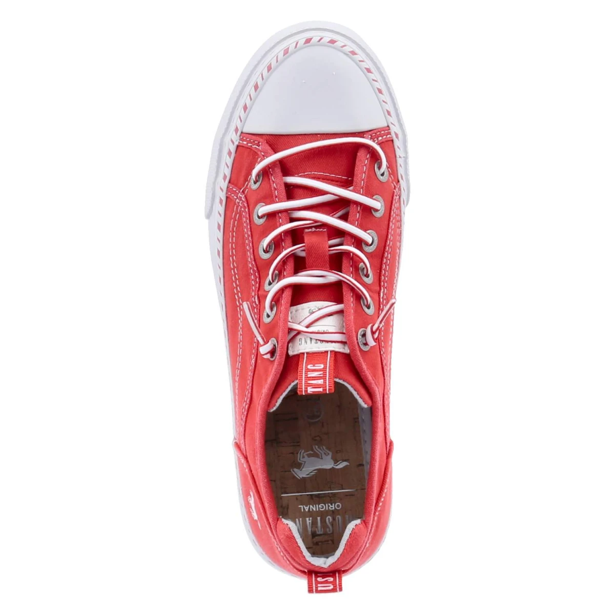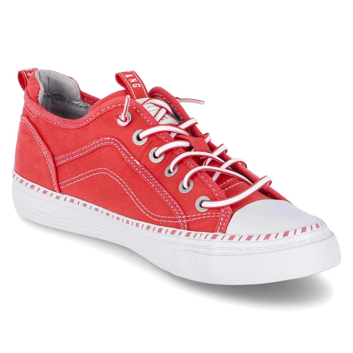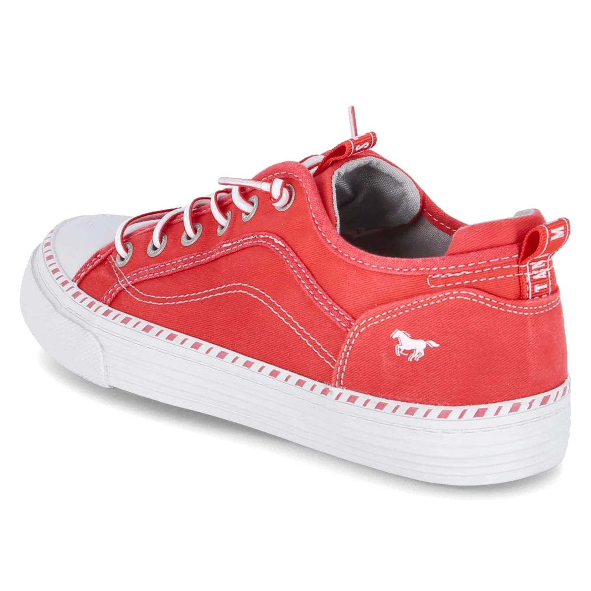 Der Slip-On-Sneaker von Mustang in kräftigem Rot bringt lässige Optik und unkomplizierten Komfort zusammen. Das robuste Textilobermaterial trifft auf eine runde Schuhspitze und eine synthetische Zehenkappe, die den verstärkten Zehen- und Fersenbereich sinnvoll ergänzt. Dank Einstieg mit Fersenpolster und zwei Anziehlaschen gelingt das Hineinschlüpfen mühelos, die elastischen Bänder in Schnüroptik sorgen für einen sportlichen Look. Ein weich gepolstertes Fußbett mit Textil- und Synthetikdecksohle begleitet durch den Tag, während die flexible, rutschhemmende Cupsohle mit Bumpern sicheren Halt gibt. Der Schnitt fällt normal aus und eignet sich als zuverlässiger Allrounder für Freizeit und Reise. Modetipp: Zu Cropped-Jeans und Ringelshirt wird das Rot zum frischen Farb-Statement, weißer Denim rundet den Look modern ab.