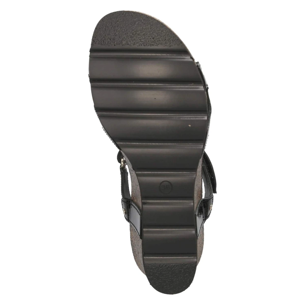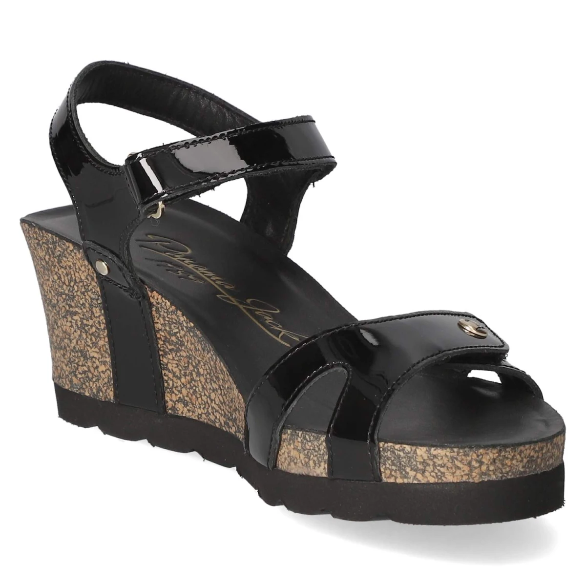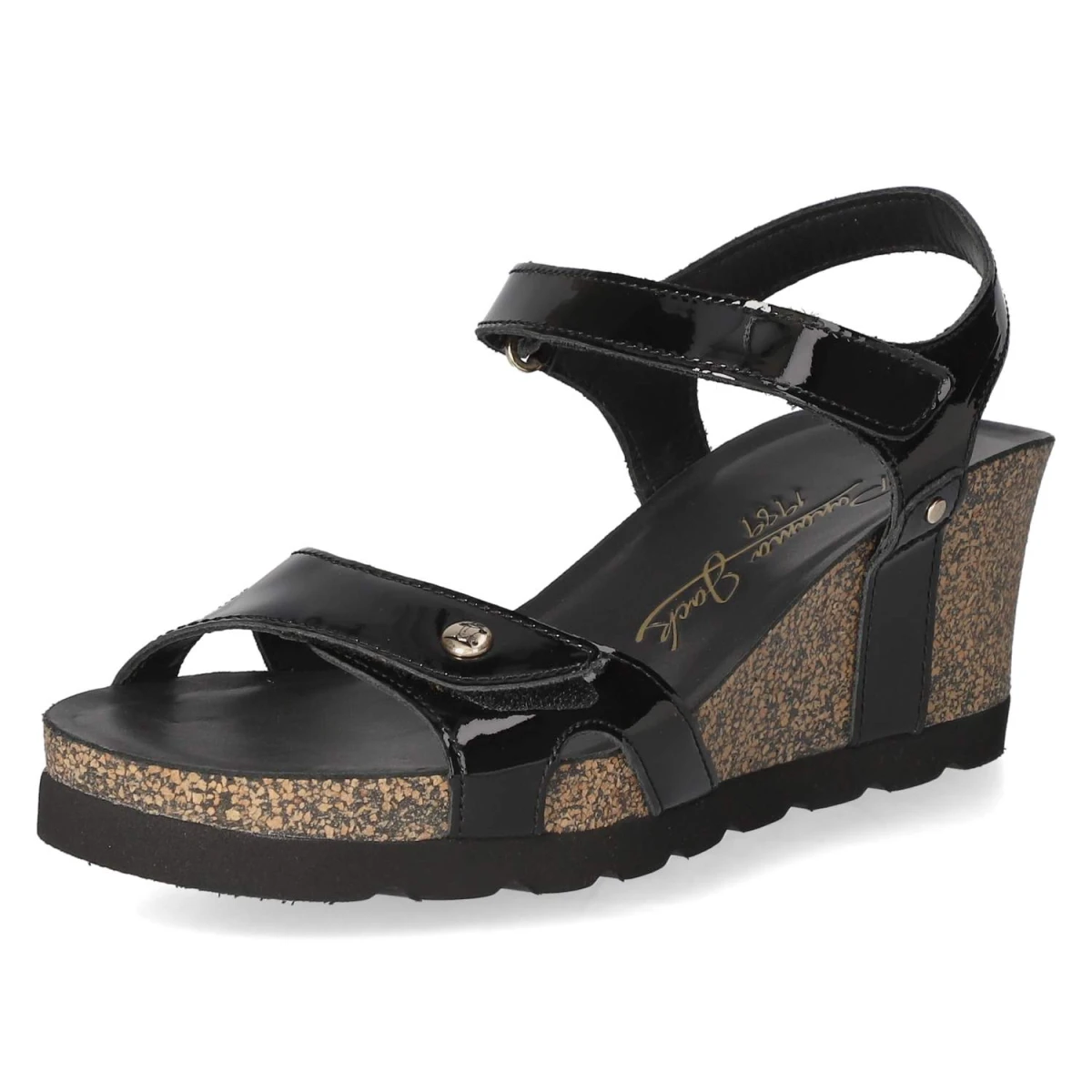 Die Sandaletten JULIA von Panama Jack setzen auf eine elegante Lackoptik in tiefem Schwarz und verbinden Komfort mit dezenter Raffinesse. Das Obermaterial aus Lackleder strahlt edel, während der 6 cm hohe Keilabsatz für eine angenehme, alltagstaugliche Höhe sorgt. Zwei praktische Klettverschlüsse ermöglichen eine individuell regulierbare Passform, die normal ausfällt, und werden von goldfarbenen Markendetails stilvoll akzentuiert. Eine weich gepolsterte Lederdecksohle und das komfortable Fußbett bieten spürbare Entlastung, die rund zulaufende Spitze gewährt entspanntes Abrollen. Die rutschhemmende Laufsohle vermittelt Stabilität auf verschiedensten Untergründen. So wird JULIA zum vielseitigen Favoriten für City, Office und Dinner. Modetipp: Zu einer fließenden Culotte und einem schlichten Top entsteht ein moderner, edler Look; feiner Goldschmuck greift die Metallakzente harmonisch auf.