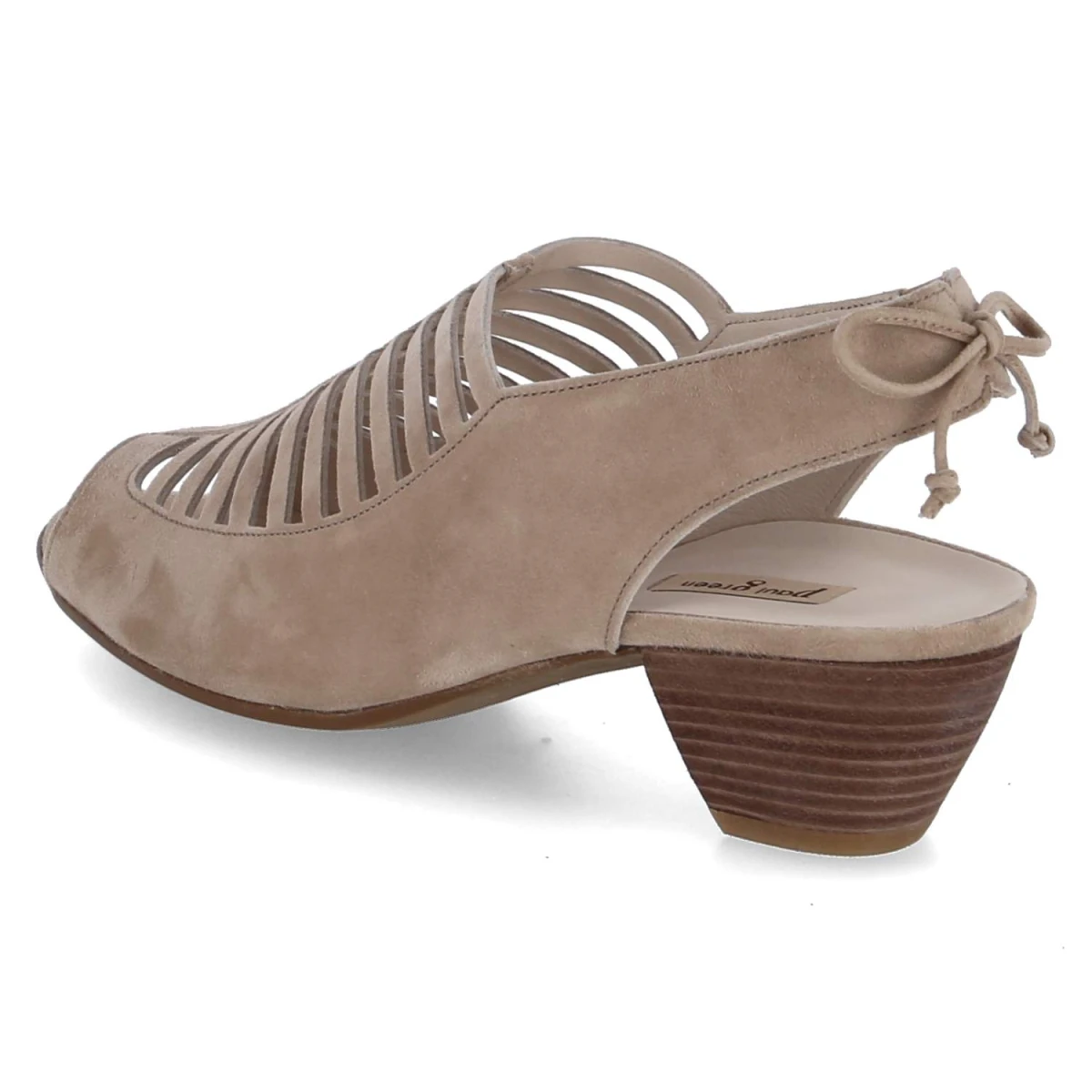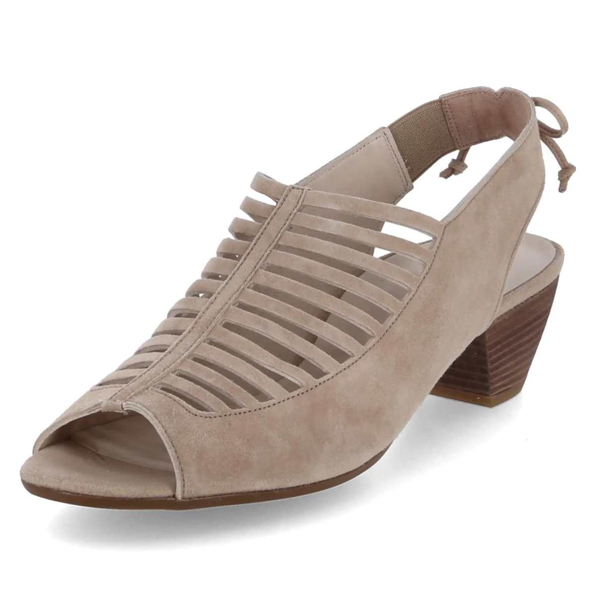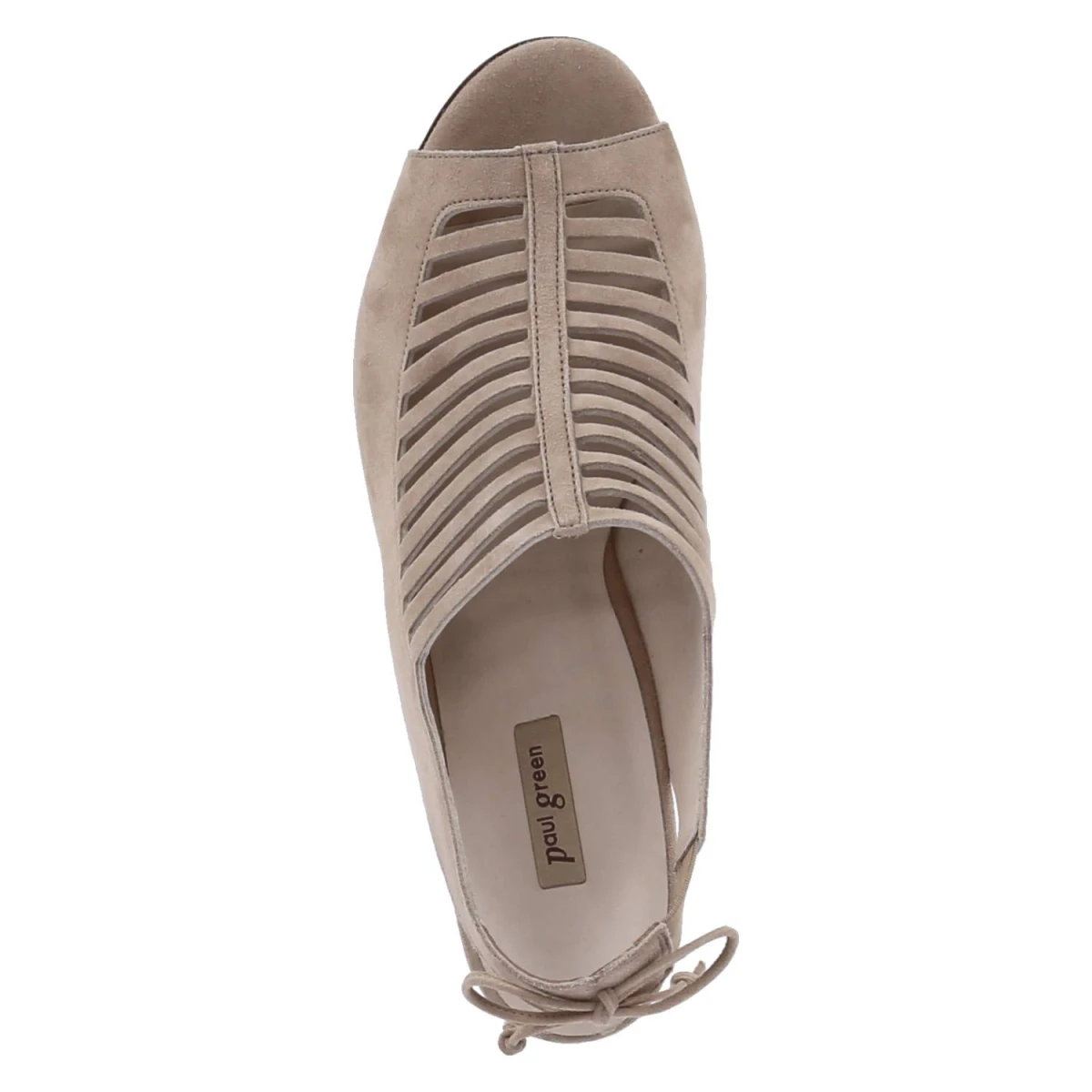 Zeitlos elegant präsentieren sich diese beigen Sandaletten von Paul Green. Veloursiges Rauleder mit samtiger Oberfläche und feine Outcuts verleihen dem offenen Design Leichtigkeit, während der chunky Trichterabsatz in Holzoptik feminine Höhe von 5 cm schenkt und sicheren Stand bietet. Der Slingriemen mit Elastikeinsatz und kleiner Zierschleife sorgt für komfortablen Halt, ganz ohne Verschluss. Hautfreundliches Lederfutter und eine Decksohle aus Leder umschmeicheln den Fuß, die flexible Laufsohle begleitet durch Alltag und Anlass. Dank normaler Passform und vielseitiger Kombinationsmöglichkeiten gelingen mühelos stilvolle Looks von Büro bis Sommerfest. Modetipp: Zu einem luftigen Midikleid in Creme und goldfarbenen Schmuckdetails entsteht ein edler Ton-in-Ton-Auftritt mit moderner Leichtigkeit.