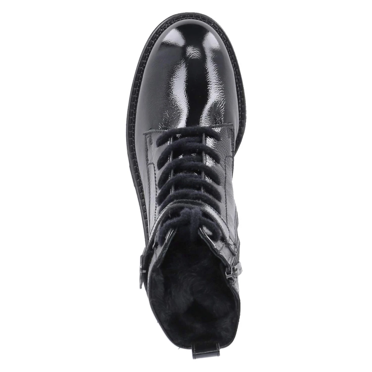 Diese Winterstiefeletten von Paul Green verbinden feminine Eleganz und wetterfesten Komfort. Glänzendes Lackleder in tiefem Schwarz und die runde Spitze verleihen der eleganten Lackoptik eine souveräne Note, während der etwa 6 cm hohe Blockabsatz stabilen Halt bietet. Warmes Kunstfellfutter und ein gepolstertes Thermofußbett umschließen den Fuß angenehm, die rutschhemmende Profilsohle sorgt für Trittsicherheit bei winterlichen Bedingungen. Schnürung und zusätzlicher Reißverschluss ermöglichen variablen Sitz und bequemes An- und Ausziehen; eine seitliche Anziehlasche und der Zierriemen mit Label setzen dezente Akzente. Der Größenhinweis fällt normal aus und macht die Wahl unkompliziert. Modetipp: Zu Strickkleid, Wollmantel und blickdichter Strumpfhose entsteht ein kontrastreicher Look, der tagsüber genauso überzeugt wie beim abendlichen Stadtbummel.