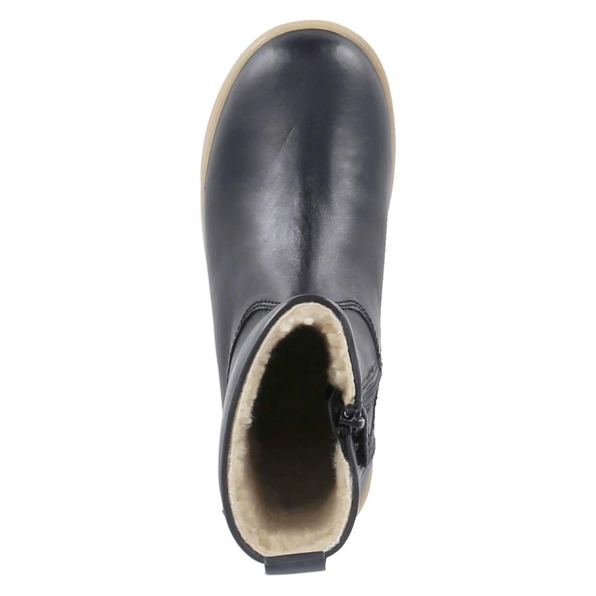 Die Winterstiefeletten von Richter verbinden robuste Funktion mit kuscheligem Komfort. Glattleder in sattem Blau trifft auf warmes Textilfutter, der rund gearbeitete Leisten bietet viel Zehenfreiheit. Dank wasserfester und atmungsaktiver Ausstattung bleiben kleine Füße auch an nasskalten Tagen angenehm trocken. Der seitliche Reißverschluss mit Klettverschlusssicherung erleichtert das An- und Ausziehen, während die verstärkte Ferse mit Anziehlasche und der weich gepolsterte Einstieg zusätzlichen Halt geben. Die flexible, rutschhemmende Laufsohle sorgt für sicheren Tritt, das herausnehmbare Wechselfußbett unterstützt eine individuelle Passform. Fällt normal aus und eignet sich perfekt für Alltag und Abenteuer im Winter. Modetipp: Zu einer dunkelblauen Steppjacke, Strickmütze und grauer Cordhose entsteht ein harmonischer Look, der Funktionalität und Stil spielerisch vereint.