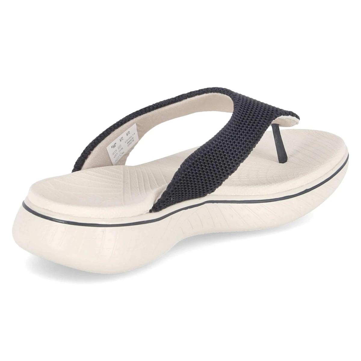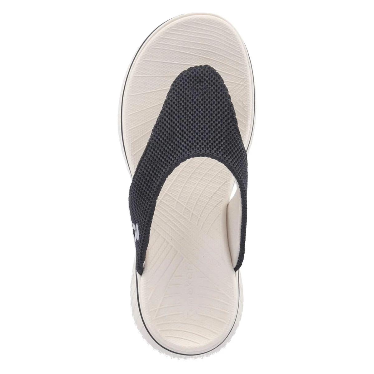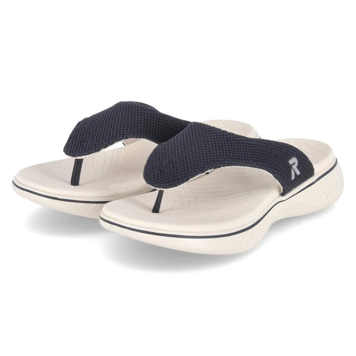 Der Rieker Zehentrenner in Dunkelblau überzeugt mit sportlichem Design und dezenter Feinstrickoptik, die je nach Licht fast Schwarz wirken kann. Das robuste Textilobermaterial sorgt für langlebige Alltagstauglichkeit, während die offene Schuhspitze und der Verschluss ohne Schnallen den sommerlichen Charakter unterstreichen. Ein gepolstertes Fußbett mit Decksohle aus Synthetik bietet weichen Auftritt, das relaxtes Leichtgewicht unterstützt entspanntes Gehen auf langen Wegen. Seitlich setzt ein reflektierendes Logo einen modernen Akzent. Die Passform fällt normal aus und richtet sich an Damen, die einen unkomplizierten Begleiter für City, Strand und Freizeit suchen. Modetipp: Zu luftigen Culottes und einem schlichten Leinenshirt entsteht ein maritimer Look; eine Basttasche und zarter Silberschmuck greifen den kühlen Blauton elegant auf.