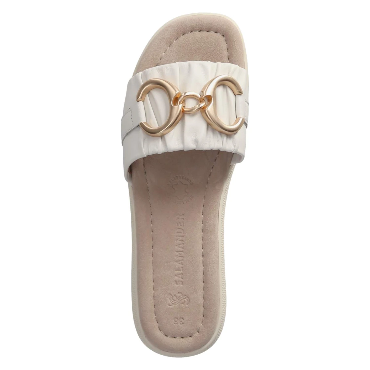 Diese weißen Pantoletten von Salamander verbinden zeitlosen Chic mit hohem Tragekomfort. Feines Glattleder und langlebiges Echtleder im Obermaterial verleihen eine edle Anmutung, während die lederne Decksohle und das weich gepolsterte Fußbett auch längere Tage angenehm machen. Die offene Schuhspitze und der unkomplizierte, verschlussfreie Einstieg sorgen für sommerliche Leichtigkeit. Ein goldfarbenes Kettenelement setzt einen glänzenden Akzent, der sowohl zu Business-Casual als auch zu Weekend-Looks passt. Die flexible, rutschhemmende Laufsohle bietet zuverlässigen Halt auf verschiedenen Untergründen. Der Schnitt fällt normal aus und entspricht der gewohnten Größe. Modetipp: Zu einer cremefarbenen Leinenhose und einem weißen Hemdblusentop entsteht ein cleaner Ton-in-Ton-Look, den zarter Goldschmuck harmonisch abrundet.