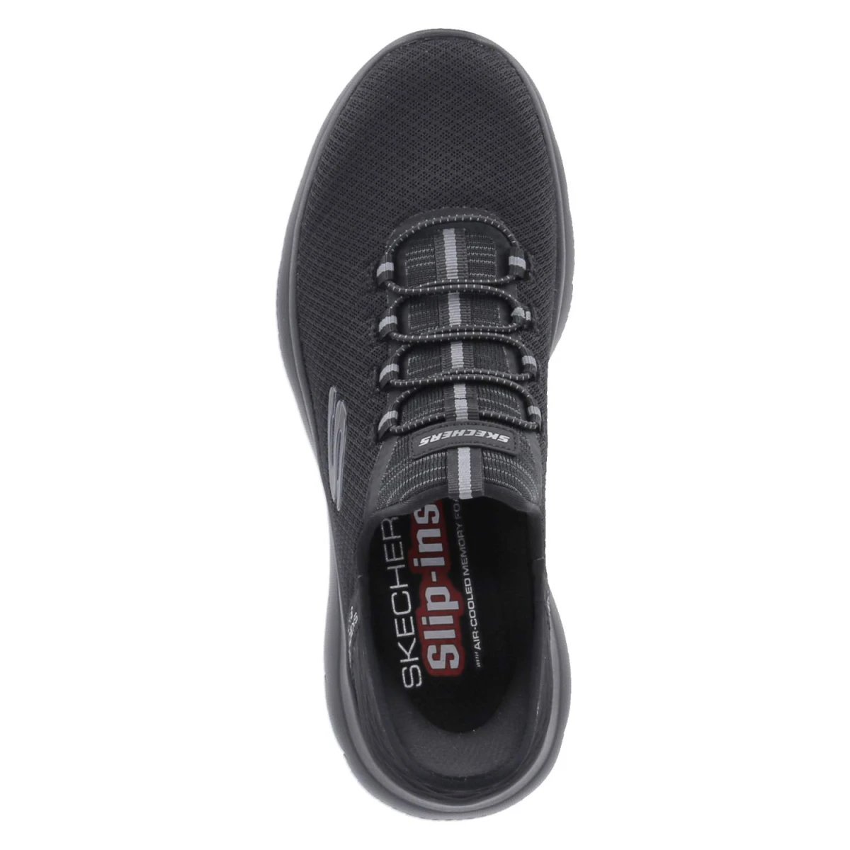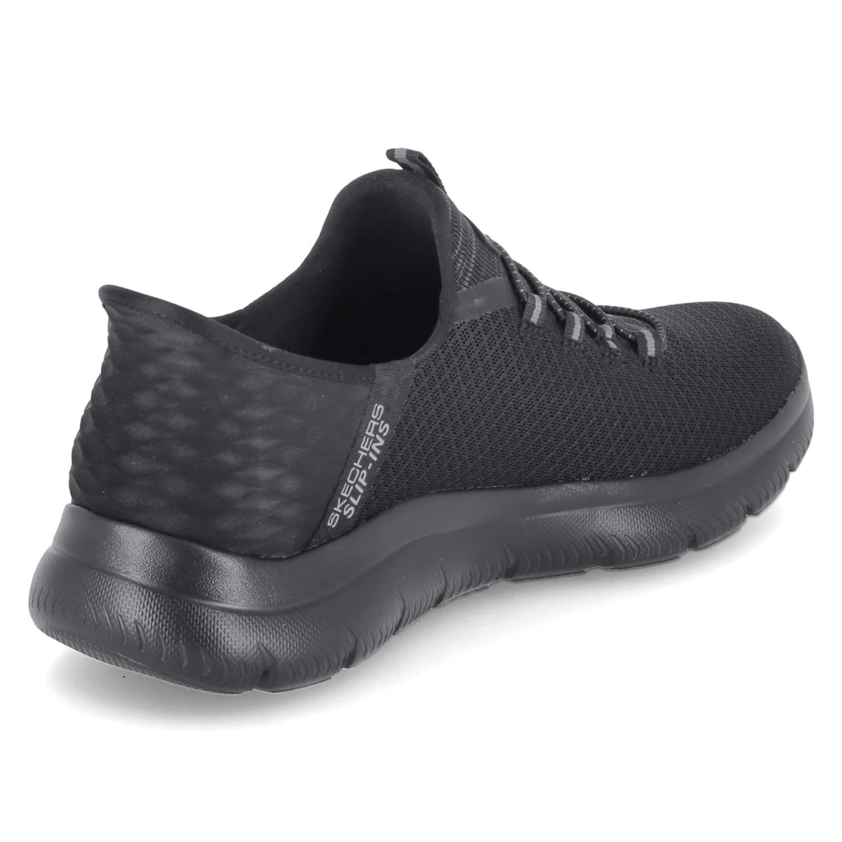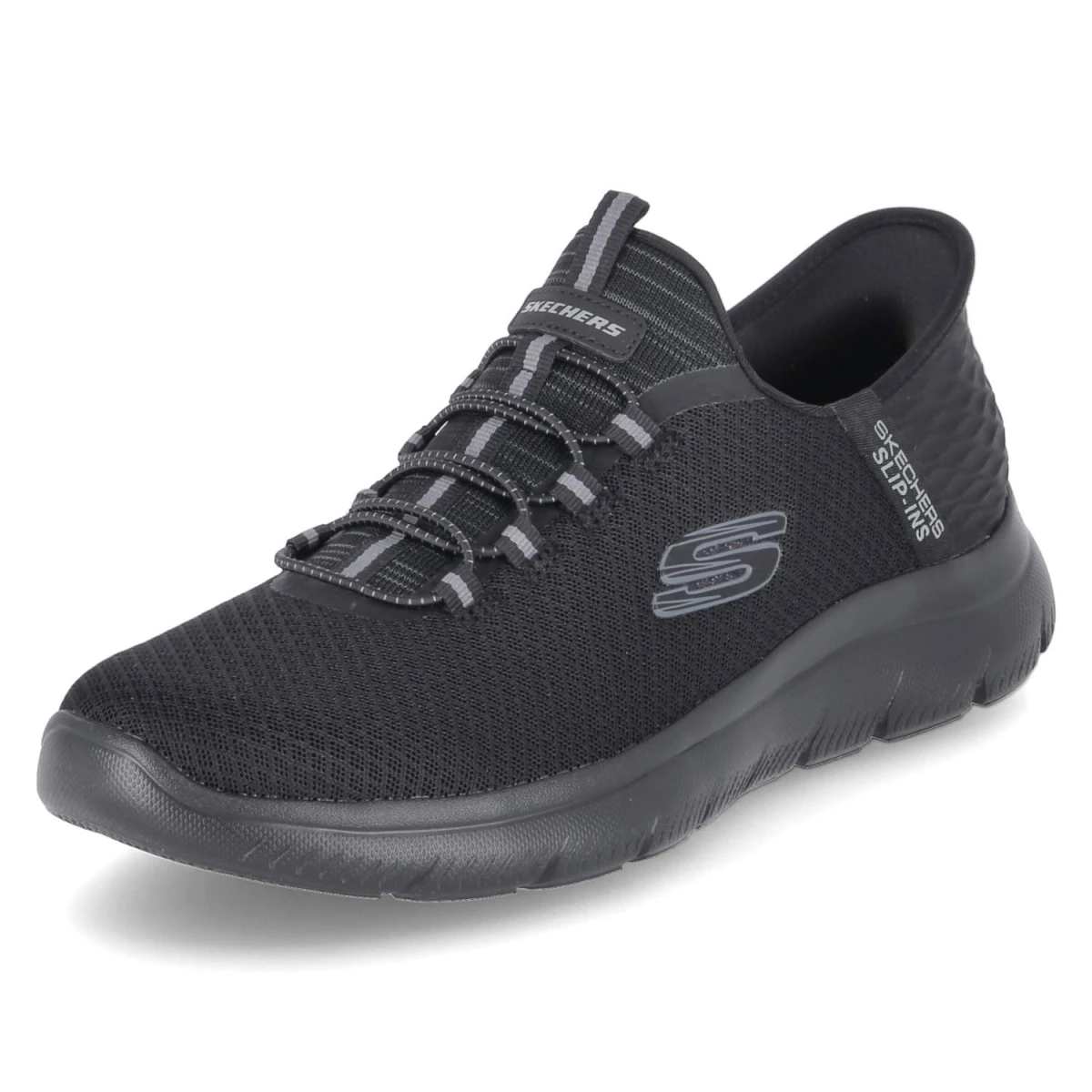 Der Skechers Slip-Ins SUMMITS vereint mühelosen Einstieg mit sportlichem Komfort. Das schwarze Obermaterial aus Textil liegt leicht am Fuß, die runde Spitze und das flexible Design sorgen für ein entspanntes Tragegefühl im Alltag. Dank bester Memory-Foam-Fußbettung passt sich die Decksohle aus Textil weich an und federt jeden Schritt. Das Modell fällt normal aus und kommt ganz ohne Verschluss aus - einfach hineinschlüpfen und losgehen. Vegane Materialien machen den Sneaker zu einer bewussten Wahl. Praktisch: Der Schuh ist maschinenwaschbar und damit schnell wieder frisch. Als vielseitiger Begleiter lässt sich das cleane Design von Freizeit bis Büro kombinieren und überzeugt durch zurückhaltende Ästhetik. Modetipp: Mit schwarzer Tech-Jogpants, weißem T‑Shirt und leichtem Overshirt entsteht ein moderner Monochrom-Look.