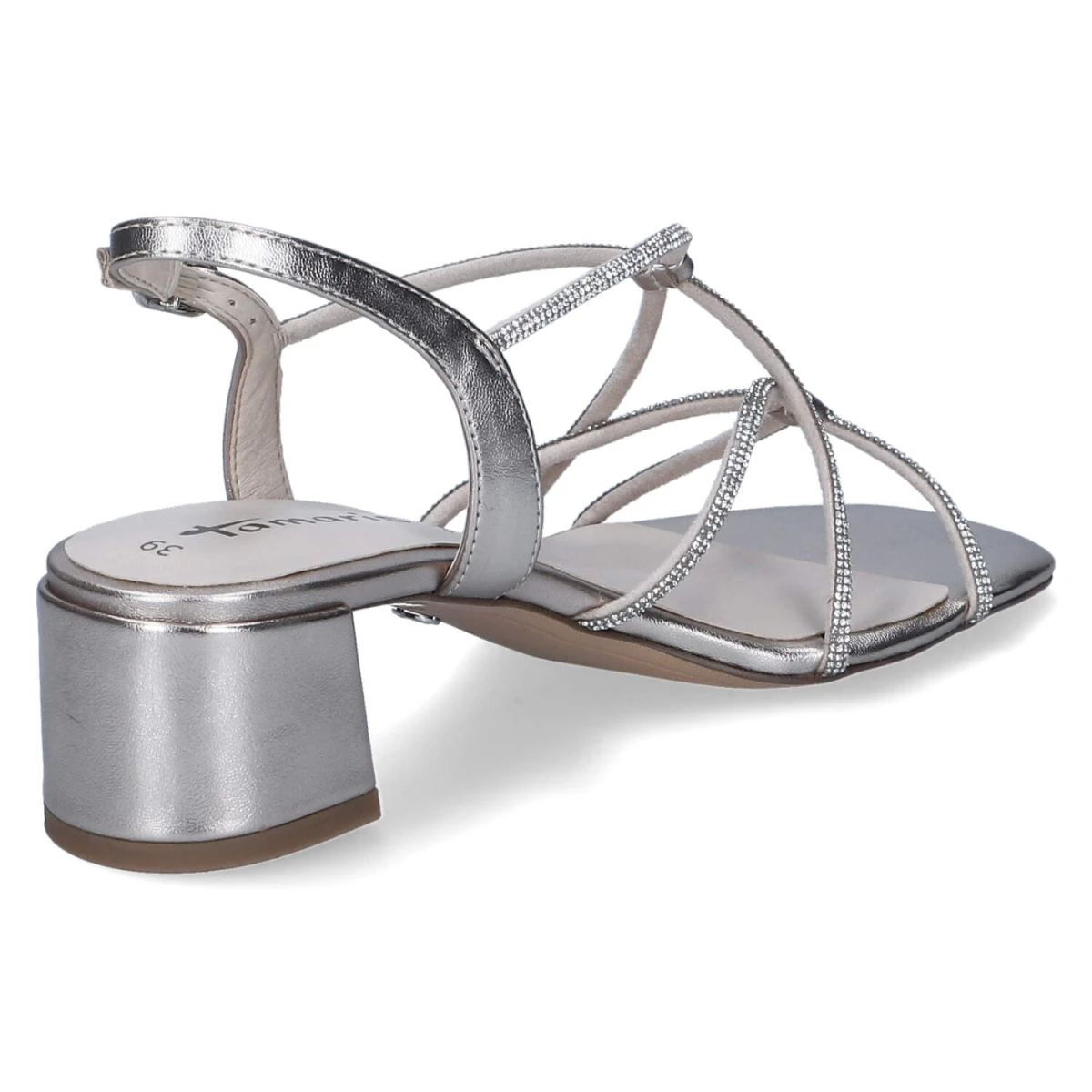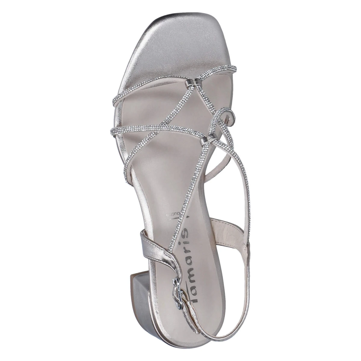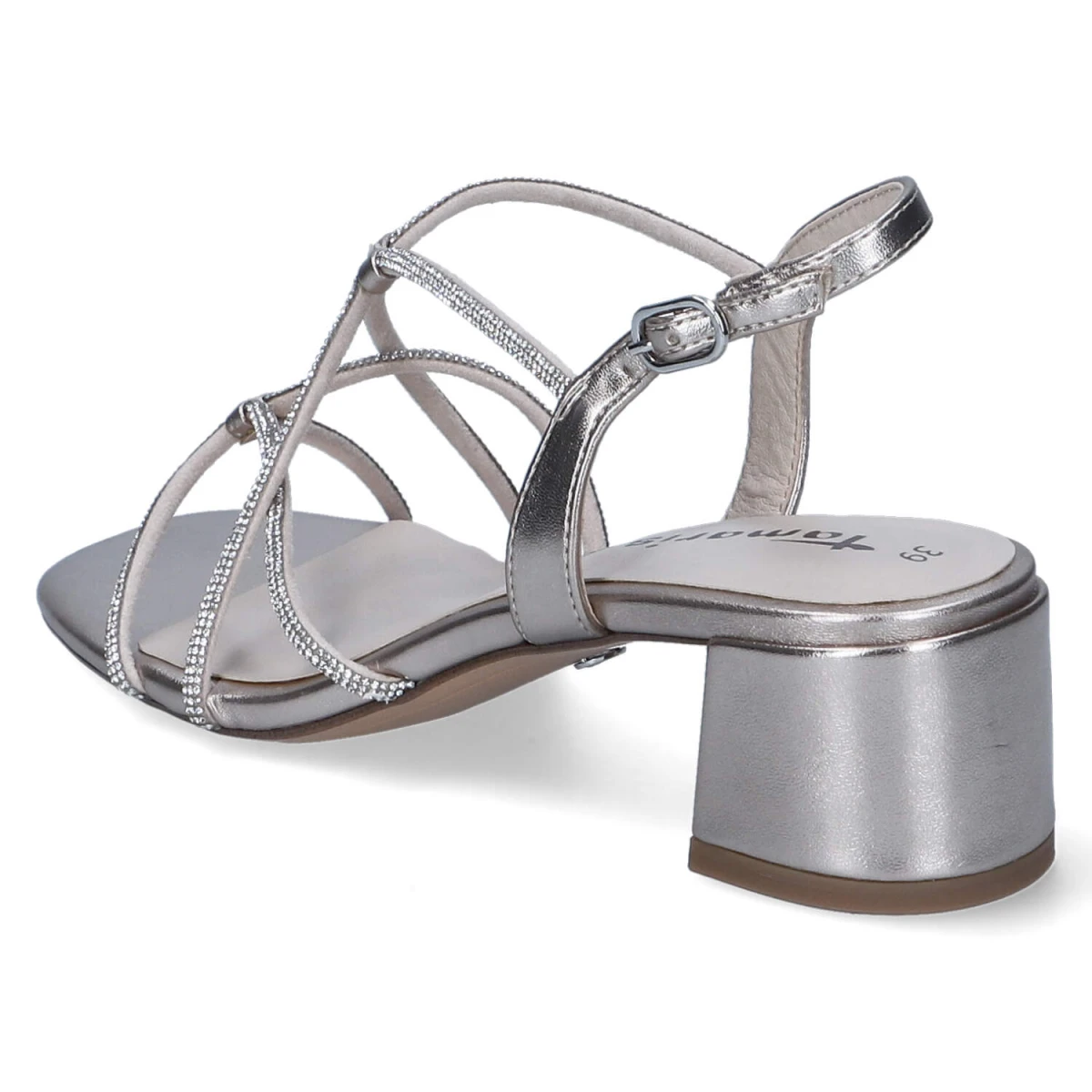 Glamouröses Statement in Gold: Die Sandalette von Tamaris verbindet funkelnde Eleganz mit wohldurchdachtem Komfort. Schmale Riemen in Metallic-Optik, veredelt mit glitzernden Schmucksteinen, umspielen den Fuß und lassen dank offener Spitze das Licht effektvoll spielen. Der 5,5 cm hohe Blockabsatz sorgt für Standfestigkeit, während das gepolsterte Fußbett und die flexible, rutschhemmende Laufsohle zuverlässig durch lange Abende tragen. Eine verstellbare Schnalle ermöglicht passgenauen Halt; das Modell fällt normal aus. Obermaterial aus Textil und Synthetik trifft auf eine synthetische Decksohle, vollständig aus veganen Materialien gefertigt. Modetipp: Zu fließendem Slipdress in Creme oder satinierten Midi-Röcken setzt das goldene Metallic-Finish strahlende Akzente; dazu dezenter Schmuck in warmen Goldtönen für einen harmonischen, festlichen Look.