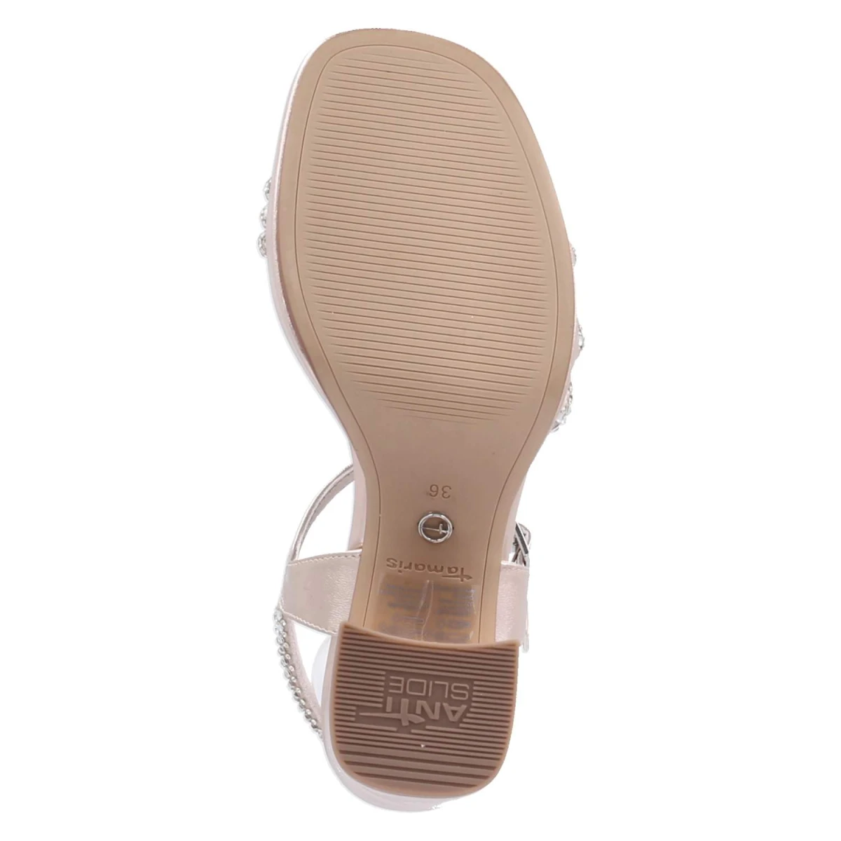 Diese Tamaris Sandaletten in zartem Rosa setzen mit ihrem metallischen Schimmer und dem glamourösen Schmucksteinbesatz ein funkelndes Statement. Der 8 cm hohe Blockabsatz verleiht Höhe und bleibt durch seine stabile Form angenehm tragbar, während die rutschfeste Laufsohle und das weich gepolsterte Fußbett langanhaltenden Komfort sichern. Die offene Spitze streckt optisch, die verstellbare Schnalle sorgt für zuverlässigen Halt. Obermaterial aus Textil und Synthetik, synthetische Decksohle, vollständig aus veganen Materialien gefertigt. Die Passform fällt normal aus und macht die Sandalette zum vielseitigen Begleiter für Feierlichkeiten, Hochzeiten oder elegante Sommerabende. Modetipp: In Kombination mit einem fließenden Midi-Slipdress und einer rosa Clutch entsteht ein monochromes Ensemble, das den Metallic-Look edel betont.